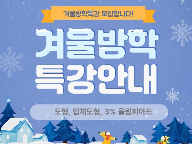 겨울방학 특강 안내 1. 초등 저학년을 위한 도형작도특강 교구로 만들어 보고 컴파스를 이용해 작도하는 수업 대상 : 초1~초3 일시 : 1월 6일 화요일 ~2월 24일 화요일 (총7회) 시간 : 매주 화요일 오전 10시30분~12시30분 수강료 : 재원생 22만원(교재비포함) 비재원생 25만원(교재비 포함) 2. 다각형과 입체도형 작도 특강 교구로 입체도형을 배우고, 직접 작도하는 수업 다각형과 입체도형의 기본성질을 알고 응용문제까지 풀어보는 수업 대상 : 초3~초6 일시 : 1월 8일 목요일 ~2월 26일 목요일 (총 7회) 시간 : 매주 목요일 오전 10시30분~12시 30분 수강료 : 재원생 22만원(교재비포함) 비재원생 25만원(교재비 포함) 3. 분수특강 대상....... <img src="https://blogthumb.pstatic.net/MjAyNTEyMTdfNDQg/MDAxNzY1OTA2NjA1NDcw.bd0nJk5MrEfrPNPHTYsGkw43FNnjK6h04bjJK-BMUcAg.VEs_8TaFMcQtSMccckwc7XIR7cBbLnmOYffAUajpQq0g.JPEG/%EA%B2%A8%EC%9A%B8%EB%B0%A9%ED%95%99%3F%8A%B9%EA%B0%95%EC%B9%B4%EC%B9%B4%EC%98%A4.jpg?type=s3" />