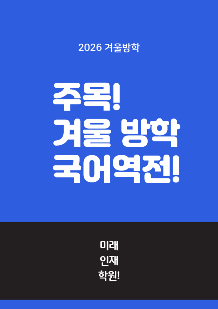 안녕하세요. 케이제이쌤입니다. 2026 신학기 이제 정말 얼마 남지 않았습니다. 이 시점에서의 선택이 1년 영어 성적을 좌우합니다. ❄️ 겨울방학은 영어 실력을 ‘점프업’할 수 있는 유일한 골든타임입니다. ✔ 지난 학기 중엔 부족했던 기본기 정리 ✔ 독해·문법·어휘력 집중 학습 ✔ 새 학기 수업을 미리 앞서가는 선행 효과 영어 실력, 이번 겨울에 확실히 바꿔야 합니다. 그 기회가 바로 지금입니다!!! 2026 중등부 겨울방학 정규수업 (1–2월 집중 프로그램) 중2 과정 총 수업량: 주 5시간 (300분) + 피드백 ① 화·목·토반 화 / 목 : 오후 3:00 – 4:40 + 복습 토 : 오후 1:00 – 2:40 + 복습 ② 월·수·금반 월 / 수....... <img src="https://blogthumb.pstatic.net/MjAyNjAxMDFfMjE1/MDAxNzY3MjY4MjU5MDI1.eK7xfOVDBnCUgClbfo4KgySOgVGNsX2VDm3g43cgF6Eg.91ZtEhUf2kc6VAfmdvb9k9eEYe6zr2bP7FO3n_JjAVIg.JPEG/b98c587d-e4bd-44bb-a4ab-a36f79ca2c8a-md.jpeg?type=s3" />