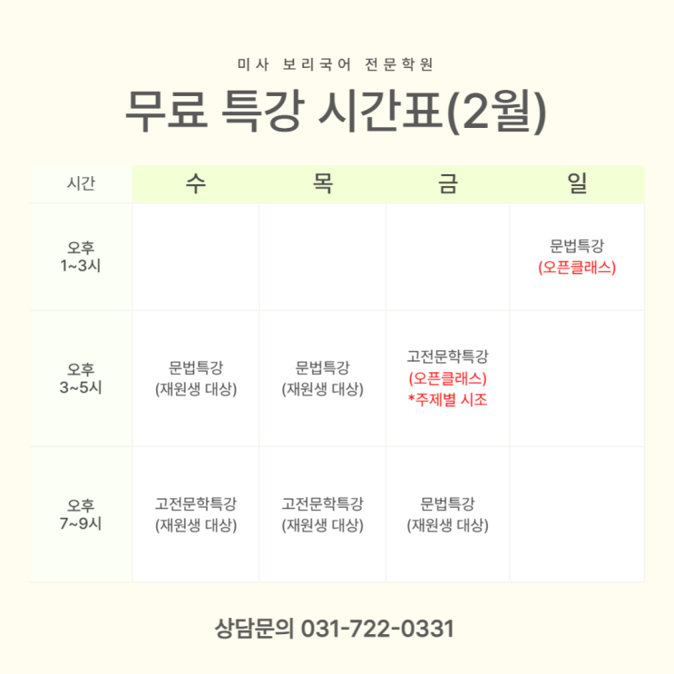 안녕하세요! 3월이 되기 전 마지막으로 나의 부족한 부분을 채울 수 있는 시간! 2월을 어영부영 보내고 후회하지 않기 위해 특강을 준비했습니다. 꼭!! 개념을 탄탄하게 준비하고 학교에 갔으면..하는 마음으로 선택권이 아주 넓은 시간표로 짜보았습니다. 영화 상영 시간표처럼 1주차의 모든 수업은 과목별로 동일하므로 (총4주 수업) 본인 스케줄에 맞게 선택하여 부족한 부분을 채울 수 있도록 합니다~!! *2월18일(수)은 설연휴로 휴강입니다.(보충X) *재원생은 신청없이 자유롭게 수강가능하며 *비원생은 오픈클래스 수강이 가능합니다.(전화: 031-722-0331 또는 구글폼으로 신청) https://docs.google.com/forms/d/e/1FAIpQLSfRB1Z7BSFd5cJ5....... <img src="https://blogthumb.pstatic.net/MjAyNjAyMDRfMjgx/MDAxNzcwMTg5MTY3NDY5.JTm9ZxydNOyASwz9GvMttBLw27wmAzESNLF3rS4bi00g.xs48lKOl_hihhu9sunI6RFzsPSfrGZg-anZTQsaSFJUg.PNG/%C0%A7%B7%CA_%BF%A9%B8%A7%C7%D0%B1%E2_%C3%D6%C1%BE_%BD%C3%B0%A3%C7%A5_7_13-001.png?type=s3" />