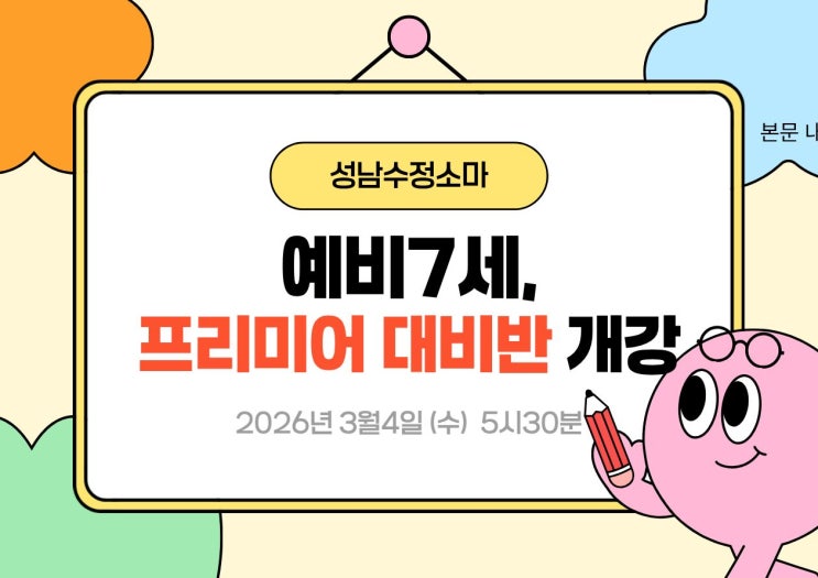 #성남수정소마 #예비7세 #프리미어대비반 안녕하세요 성남수정소마 원장 권태희 입니다. 작년까지 소마 프리미어반은 7세 11월에 선발테스트를 통해 운영되어 왔습니다. 2026년부터 7세 프리미어반 선발 테스트가 8월로 변경됨에 따라 아이들이 준비과정에서 방향을 잃지 않고 안정적으로 성장할 수 있도록 프리미어테스트 대비반을 운영합니다. 이 대비반은 단순 문제풀이가 아닌, 프리미어테스트에서 요구하는 사고의 깊이와 속도를 함께 기르는 과정입니다. 프리미어테스트는 단순한 사고력 공부가 아닙니다. 프리미어대비반에서 준비하는 공부 프리미어대비반에서는 다음과 같은 핵심 학습을 집중적으로 다룹니다. 1. 문제를 읽고 핵심 파악....... <img src="https://blogthumb.pstatic.net/MjAyNjAyMDhfMTM1/MDAxNzcwNTIxNzE0MzIy.LXaHf7EnOPz8AJAgvVtHrDbNfQYcbG88Zl5uTws1IeMg.ySFwmik3b-6cguahZ5fhqmlQbmzikpHYsWeFBi9tHCsg.JPEG/%C1%A6%B8%F1%C0%BB_%C0%D4%B7%C2%C7%D8%C1%D6%BC%BC%BF%E4._%285%29.jpg?type=s3" />