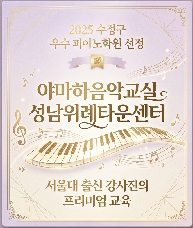 위례피아노학원 추천! 야마하음악교실 성남위례타운센터, 2025 수정구 우수 음악학원 선정...서울대 출신 강사진의 1:1 밀착 지도