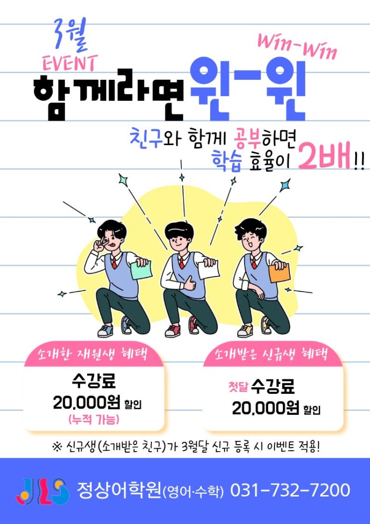 안녕하세요 성남 정상어학원입니다:] 새 학년, 새 학기라는 설렘과 함께 "이번 학기에는 정말 열심히 해봐야지!" 하는 다짐들을 모두 하고 있나요?ㅎㅎ 새로운 시작을 앞두고 의욕이 넘치지만 한편으로는 공부가 어렵게 느껴지거나 작심삼일로 끝나지 않을까 걱정되는 마음도 있을 거라 생각해요. 그래서 성남 정상어학원에서 우리 학생들의 힘찬 새 학기를 응원하기 위해 특별한 이벤트를 준비했습니다! 혼자 공부하는 것보다 마음 맞는 친구와 함께할 때 시너지도 더 커지는 법이죠? 서로 모르는 것도 물어보고, 선의의 경쟁도 하면서 즐겁게 할 수 있도록 이름하여 <함께라면 윈윈!> 이벤트를 시작합니다 ♀️함께라....... <img src="https://blogthumb.pstatic.net/MjAyNjAyMTBfMjYg/MDAxNzcwNzAxMjAyMjM3.-BB91gq15nt31sYF0pt-pDDynOcOjYpxauwPAkzSYh4g.VWadUby_AB_6jay298InsRteQBBduE1USXrTnl03Fvgg.JPEG/4.jpg?type=s3" />