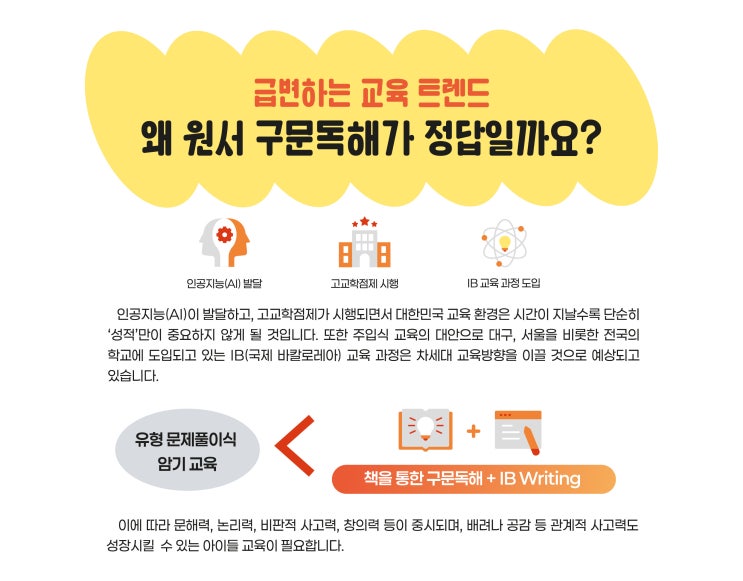 AI 시대, 영어 공부는 달라져야 합니다 인공지능이 빠르게 발달하면서 이제 단순한 암기와 정보 처리는 AI가 더 빠르고 정확하게 해내는 시대가 되었습니다. 그렇다면 아이에게 남는 질문은 하나입니다. “그 정보를 가지고 무엇을 생각하고, 어떻게 연결하고, 어떻게 표현할 것인가?” 성적은 여전히 중요합니다. 하지만 이제는 암기력만으로 만들어지는 성적은 한계가 분명해지고 있습니다. 고교학점제, 수행평가 확대, IB 교육과정 도입 흐름 역시 같은 방향을 가리키고 있습니다. ✔ 정답을 아는가보다는 ✔ 왜 그렇게 생각하는가 ✔ 어떻게 설명할 수 있는가 ✔ 스스로 논리를 세울 수 있는가 를 묻는 구조로 교육 트렌드가 바뀌고 있습니다....... <img src="https://blogthumb.pstatic.net/MjAyNjAyMTFfOSAg/MDAxNzcwNzk3NjM1MDQ5.nO3KRP4zOPVC1SIXadQhdKSUVA3CschsOC6x5q1aaDkg.EODU8N0qafmwwIXztpO4CP1qNmO8Xv5a35RoYZV0XDYg.JPEG/KakaoTalk_20260211_130803702_01.jpg?type=s3" />