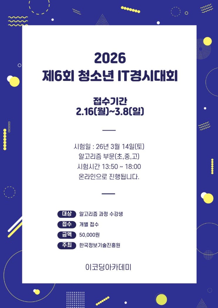 안녕하세요! 알고리즘반 수강생들을 위한 대회 안내입니다 26년 제6회 청소년IT경시대회 접수 : 2.16(월) ~ 3.8(일) 추가접수 : 3.9(월) ~ 3.11(수) 접수비 : 50,000원 대회 시스템 체험 : 3.12 10:00 ~ 3.13 22:00 대회개최 : 3.14(토) 13:50~18:00 가채점결과발표 : 3.20(금) 최종결과발표: 3.26(목) 자세한 내용과 접수는 "한국정보기술진흥원" (kitpa.org) 공식사이트를 참조하시기 바랍니다. https://kitpa.org/contest/6 대회는 온라인으로 개최됩니다. 알고리즘 수강생들은 모두 참가하길 추천드립니다. 시험시간은 총 3시간 30분으로 초,중,고 부문으로 나뉘고 C++ 을 선택하여 진행합니다. 메이저 대회인 정보올림피아드와 유....... <img src="https://blogthumb.pstatic.net/MjAyNjAyMjVfMzIg/MDAxNzcxOTkwOTM5NjY3.FVgLIcdAbSFNxLZ7z-XqpdSx2n8cv99s7MkNxlj6DGEg.JNG_f3GCXyZ9I9QYShLEzH6zN50Weiqv2B8UnRcjnCEg.JPEG/%C1%A66%C8%B8%C3%BB%BC%D2%B3%E2IT%B0%E6%BD%C3%B4%EB%C8%B82.jpg?type=s3" />