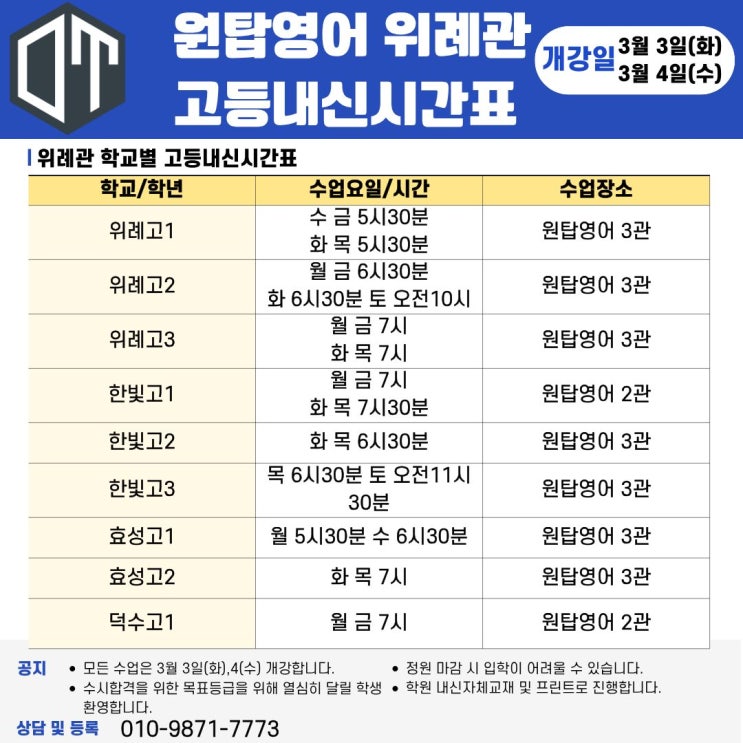 안녕하세요. 원탑영어학원입니다. 3/3(화)부터 시작되는 위례관 / 감일관 새학기 고등 내신 대비 학교별 시간표를 안내드립니다. 학교 내신 교재는 학원 자체 교재로 준비하여 첫 수업 시간에 배부할 예정입니다. 기존 재원생들은 기존 어휘 교재 및 과제를 지참하여 첫 수업에 참여해 주시기 바랍니다. 감사합니다. <img src="https://blogthumb.pstatic.net/MjAyNjAyMjJfMTY0/MDAxNzcxNzM1OTQzNTc1.NHLuylW9Nwv7WQ2d7J9BlhzOhGCLhrWWgufD6_g0RmQg.CnnxL4qdDX3hZvG8FyU7KNklQYMuwHkhs9C3fJOtegkg.JPEG/%C0%A7%B7%CA%B0%FC%BD%C3%B0%A3%C7%A5.jpg?type=s3" />