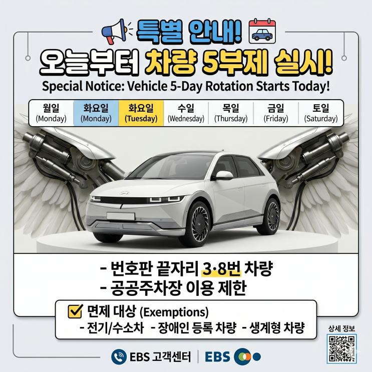 As of today / vehicle restrictions / under the 5 day rotation system / kick in / at more than 30,000 public parking lots / across the country. 오늘부터 / 차량 제한이 / 5부제 시스템에 따른 / 시작됩니다 / 3만 개 이상의 공공 주차장에서 / 전국적으로. Weekday access / is tied to / the last digit of license plates / with exemptions / for electric and hydrogen cars, / disabled drivers / and livelihood related vehicles / getting a free pass. 평일 출입은 / 연결되어 있습니다 / 번호판의 마지막 숫자와 / 예외와 함께 / 전기차와 수소차, / 장애인 운전자 / 그리고 생계형 차량들을 위한 / (이들은) 자유 통과권을 받....... <img src="https://blogthumb.pstatic.net/MjAyNjA0MjhfMjc5/MDAxNzc3MzM1Mjk5NDA5.qJeQUojxSxKEv8PYEV9cpg5_j3E05nYRFt02vaf1nBsg.carGxLIQzFb78EKIjEa5JT7hvRqyB3idFAtXyXX9T0og.PNG/Gemini_Generated_Image_755nk5755nk5755n.png?type=s3" />