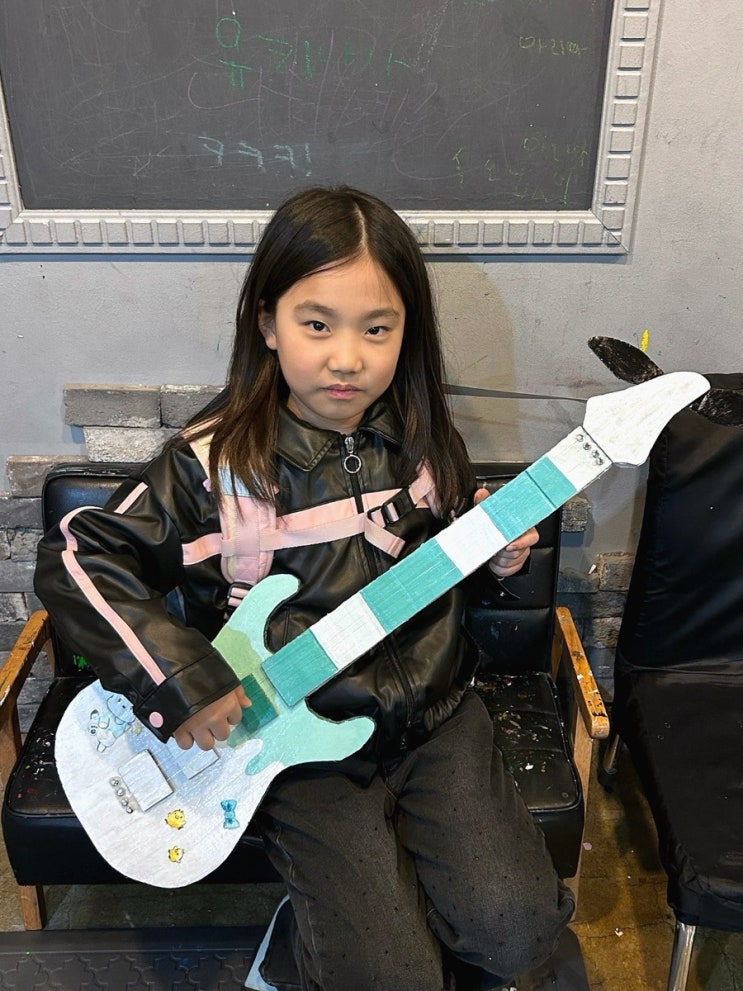 오늘의 수업은 기타 만들기 입니다! 설혜는 이번에 파스텔 커리큘럼 중에 기타 만들기를 시작했습니다! 그냥 기타보다는 좀 더 큰 일렉기타로 시작했습니다!! 색깔은 포차코 대표 색깔 민트색으로 선정했습니다! 아이스크림이 흘러내리는 느낌으로 만들어줬습니다! 일렉기타의 포인트를 살려서 만들어주고 포차코도 그려줬습니다! ՞⸝⸝ʚ̴̶̷̷ · ʚ̴̶̷̷⸝⸝ ՞ 너무 귀엽죠! 일렉기타의 두께감을 나타내주기 위해서 골판지를 잘라서 설혜가 열심히 글루건으로 붙여줬습니다!! 이제 글루건도 스스로 잘해요 `⎚⩊⎚´ -✧ 오늘은 바니쉬를 발라서 기타 코팅을 해줬습니다! 줄 연결 후 포차코 귀를 기타에 붙....... <img src="https://blogthumb.pstatic.net/MjAyNjA0MDFfMTM2/MDAxNzc1MDE2NjkzNDgy.HcpS5OJinW-zMEUaXI8xa0K0xPTmxh7p5y5qvE88Mt8g.bZm9UFU84t8ifUckrAUEZ9GuJpgQXrMmU24MgWyXybYg.JPEG/output%A3%DF367977973.jpg?type=s3" />
