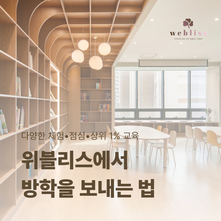 위례에서 초등 저학년 아이의 방학을 어떻게 보내야 할지 고민 중인 학부모님을 위해 위블리스 위례 방학 특강을 소개합니다. 안녕하세요, 위례 초등 명문 교육기관 위블리스입니다. 위블리스의 위례 방학 특강 프로그램은 아이의 잠재력을 깨우는 '성장의 시간'으로 만들기 위해 초등 저학년 맞춤 커리큘럼으로 운영되고 있습니다. 다양한 경험, 학습, 점심, 돌봄 등이 분리되지 않고 하루 프로그램 안에 모두 구성되어 있어 워킹맘의 만족도가 높습니다. 안정적인 운영을 위하여 방학특강은 재원생만으로 운영되고 있습니다. 국•영•수 체계적인 학습은 물론 리틀 잡월드, 그림책 Art Lab 등 다양한 경험을 할 수 있는 프로그램과 건....... <img src="https://blogthumb.pstatic.net/MjAyNjAyMDlfMjc1/MDAxNzcwNjM1OTc5MzUy.RnM5TnUvisCmn7Q2FXWR8dPMeWRUnLCi93yFz7ur4R0g.ip8WuzP8SjAYMg61G7qGLGxsDNzrGbuo5L0Q2qm9IK4g.JPEG/%C0%A7%BA%ED%B8%AE%BD%BA_%B9%E6%C7%D0.jpg?type=s3" />