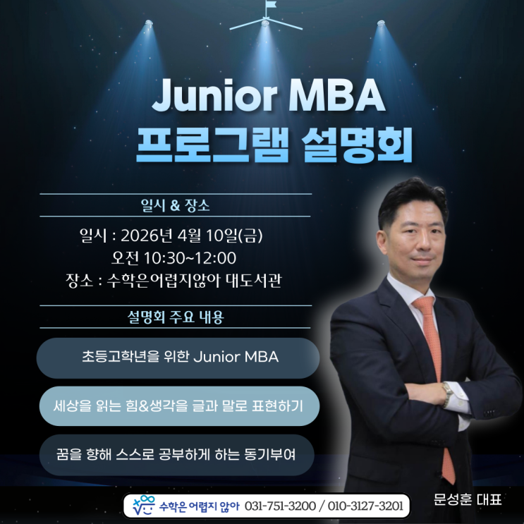 안녕하세요, 위례 수학학원 수학은어렵지않아 원장 송명주입니다. 수학학원 원장이 왠 MBA냐구요? 제가 20년간 아이들을 가르치면서 크게 느낀 한가지 확신이 있습니다. 수학점수를 올리는 것 보다 훨씬 어려운 일, 그건 바로,공부하고 싶은 아이로 만드는 일입니다. https://youtu.be/UOyhw-3Smt4 보통은 성적이 정체되면 학원을 갈아타거나(?) 부족한 부분의 문제집을 늘립니다. 그런데 아이는 왜 공부해야하는지 모르는 상태라면? 학원을 바꿔도 문제집을 늘려도 결과는 달라지지 않습니다. 반대로,공부할 이유를 찾은 아이는 스스로 달리기 시작합니다. Junior MBA는 바로 그 출발점을 만들어 주는 프로그램입니다. Junior MBA 설명회 주니어....... <img src="https://blogthumb.pstatic.net/MjAyNjAzMzFfMTUz/MDAxNzc0OTY2OTM4MTA5.DV32_VUdqIz0wyy8UMCHJKeTJCrAs5NvJdDA-miLBbUg.v6QsE-sFjp-4q1E2N5BH1SnFshNG6CjZCnYbJRW-Lj8g.PNG/%BC%F6%BE%EE%BE%C8%BC%B3%B8%ED%C8%B8-068.png?type=s3" />