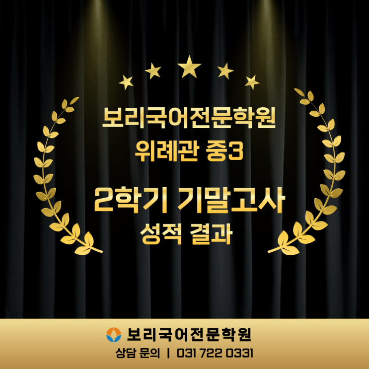 안녕하세요! 위례 보리국어 전문학원입니다. 오늘은 기말고사 성적 결과를 가지고 왔습니다! 학생들이 잘 따라와 줘서 좋은 결과가 있었답니다 특히 한빛중 친구들은 재원생 모두 100점을 받았네요! 상담 문의 031 -722 -0331 <img src="https://blogthumb.pstatic.net/MjAyNTExMjJfMTkx/MDAxNzYzNzg1NzMxMTUx.resZ2jq9E_O4d6ga22HGuzGo_twoxyrnplWZ3JTGMoAg.IskdOry4w9hdqfnCanjhld6-2nS2ap79TJ9eNmMwbCMg.PNG/4.png?type=s3" />
