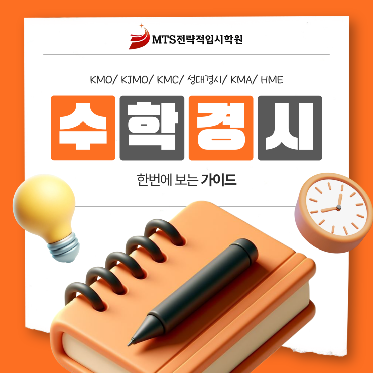 안녕하세요, MTS 학원입니다. 오늘은 주요 수학 경시대회! KMO, KJMO, KMC, 성대경시 그리고 그 하위위 레벨의 KMA, HME까지 전체를 한 번에 비교·정리해드리는 시간을 준비했습니다. 아이에게 맞는 대회를 선택하시고, 앞으로의 학습 계획을 세우는 데 분명 큰 도움이 되실 거예요! 1. KMO (한국수학올림피아드) KMO는 말 그대로 대한민국 수학의 정점에 서는 학생들이 도전하는 무대입니다. 아이의 사고력뿐 아니라 증명 논리, 문제 해결 과정, 수학적 표현까지 모두 평가되기 때문에 수학 영재학교나 특기자를 준비하는 학생이라면 반드시 거쳐가야 하는 시험입니다. KMO 출제 범위 KMO는 국제올림피아드(IMO) 기준과 동일하게 정수, 대수, 조....... <img src="https://blogthumb.pstatic.net/MjAyNTEyMTBfMjMy/MDAxNzY1MzYwNzcwODg5.Yuk3lvl4JJMb94h779fAGD1-fFqkO7FExzOGGI7naPgg.yDYg32LT7WdLUBhZBTxN_iaHJn9MADAE_Cwg51vWB5Ug.PNG/%C1%A6%B8%F1%C0%BB_%C0%D4%B7%C2%C7%D8%C1%D6%BC%BC%BF%E4.png?type=s3" />