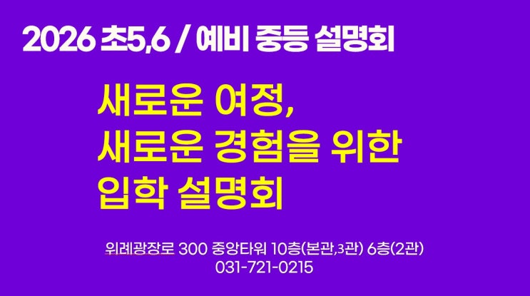 더블원영어입니다 2026 초등5,6학년과 예비중등 설명회가 있습니다 일시 및 장소 1차 12월 17일 (수) 오전 11시 2차 12월 20일 (토) 오전 11시 더블원영어 2관 (중앙타워 6층) 화려한 입시설명회 느낌보다는 학원의 커리큘럼과 관리시스템 더블원만의 특징으로 부담없이 편하게 이야기할 수 있는 시간입니다 다과와 따뜻한 티가 준비되어 있으니 편하게 오셔서 얘기나누시면 좋겠습니다 감사합니다 상담문의 031-721-0215 <img src="https://blogthumb.pstatic.net/MjAyNTEyMTBfMzUg/MDAxNzY1MzUyMTY5NzI2.L5eOG5_swJjTcZmXGpBGHFq73QxiEjlKMN-T-7xCxUwg.gQ1DOXzTeoQIcHgjJpCdMuTvyWP4X0gNKHxDCsgHd4og.JPEG/%C3%CA5%2C6_%BF%B9%BA%F1%C1%DF.jpg?type=s3" />