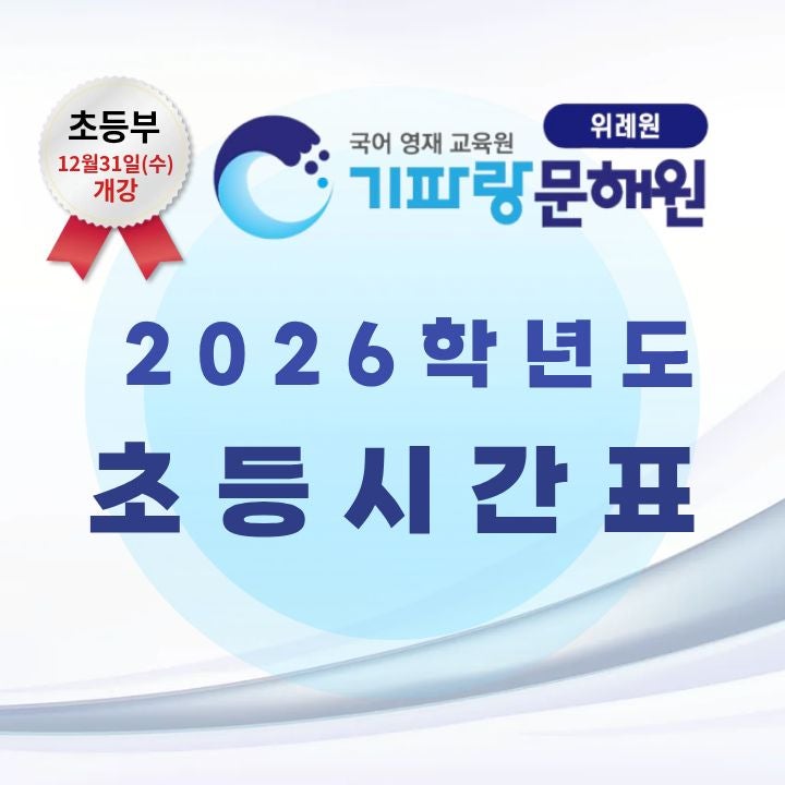 기파랑문해원 위례원 2026년 초등 시간표 '2026년 12월 31일 대 개강' [ 기파랑 문해원 위례원 초등 수업 안내] 정규 수업은(2시간 30분)+주간 테스트 재시험(약 10분)=최 대 3시간 수업 ◆학생들의 수요에 따라 시간표가 수정될 수 있습니다. ◆인원이 3명 이하인 반은 개강되지 않을 수도 있습니다. * 보강은 월 1회만 가능하며 미 수강 시, 수업료는 이월되지 않습니다. * 당일 결석은 보강 및 강의 영상이 제공되지 않고, 교육비 차감도 불가합니다. 2026년 새 학년 새 학기 기파랑문해원 위례원에서 국어교육의 초석을 탄탄하게 다지시는 한 해가 될 수 있도록 항상 최선을 다하겠습니다. 기파랑문해원 위례원 2026학년도 새....... <img src="https://blogthumb.pstatic.net/MjAyNTEyMTBfODcg/MDAxNzY1MzU4MjgxNTg5.jQF0DJVSsHgsOM4s_wdqDwhvTz-Bt5wX28rbz1sa6Jkg.8K8Ms-OUhjnNgYN7Gj6GgHEi4lxPQ8oQabzQWzBWOW0g.JPEG/%BD%E6%B3%D7%C0%CF.jpg?type=s3" />