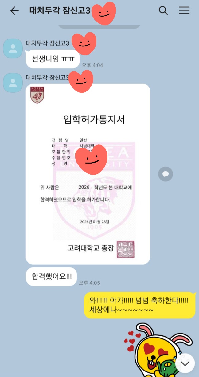 정시 발표 시즌입니다. 23일에 고대가 정시 합격자 발표했구요 특히 울 동네 아가라서 볼 때마다 반가웠고 다정하고 성실하던 제자녀석이 최초합 했습니다! 합격 넘넘 축하한다~♡ 곧 저희학원 조교로 합류할 예정입니다. 겨울방학 정규수업 및 특강으로 정신없다가 생존신고 겸 포스트 하나 올립니다. 1, 2 자습실에서 열공하는 우리 예비고2 아가들 (이 날은 화-목반 7시 수업 전). 저희 학원 분위기는 공부 외엔 일체 가능하지 않(!)습니다ㅎㅎ 방학때도 변함없는 조교팀의 학생별 리뷰테스트 코멘트! 아이들 하나하나 취약점을 콕콕 집어서 결국 채우도록 만듭니다. 우리 예비고1 아가들 교재입니다 단어/문법/구문/독해/워크북 뭐하나 빠지....... <img src="https://blogthumb.pstatic.net/MjAyNjAxMjdfMjU2/MDAxNzY5NDUwNzQxMDQ1.H2qPxZI6NxVmX6vYB8B-85hZdN9yD2iqc4ctWhP8OxEg.ybadQES2hFqKkJDIFUh2hd-RprP6cWHduaHSQS6fq-4g.JPEG/1769184318315.jpg?type=s3" />
