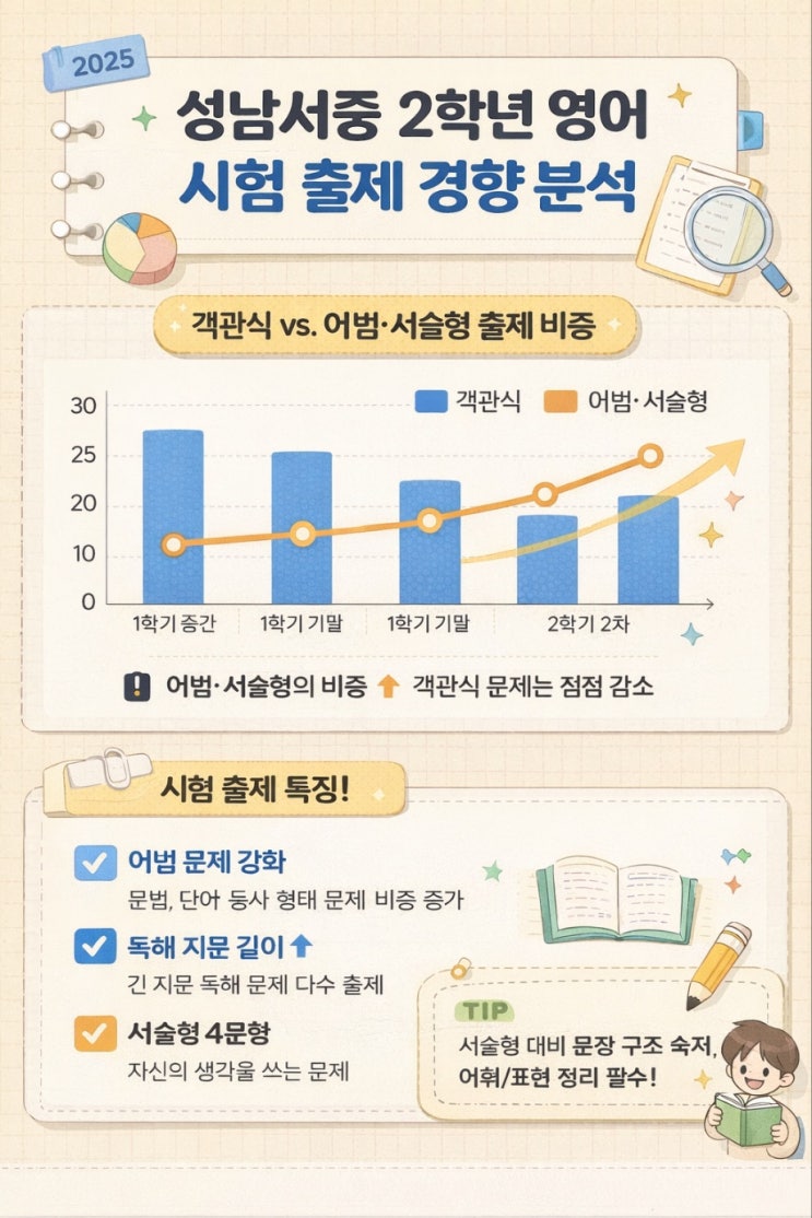 성남서중 2학년 영어 2차 지필 – 출제 경향 총정리 교과서 기반 독해 + 문법 기본기 확인 + 필수 어휘 점검이라는 반영된 시험이었습니다. 난이도는 중간, 평소에 수업을 성실히 했던 학생이라면 충분히 고득점이 가능한 구조였습니다. 이번 시험은 독해 문항이 전체의 절반 이상을 차지했습니다. 지문 길이는 중간 정도였지만, 단순 내용 일치보다 문맥 파악·흐름 이해를 요구하는 문제가 늘어난 것이 특징입니다. ●글의 흐름을 연결하는 빈칸추론 ●‘가장 적절한 내용’ 찾기 ●문장 배열 ●글의 요지 파악 이런 문제들이 점수를 크게 가르는 핵심이었습니다. 1️⃣ 핵심: 독해 중심 시험 (지문 비중 70~80%) 시험 전체의 절반 이상이 독해....... <img src="https://blogthumb.pstatic.net/MjAyNTEyMjJfMjIz/MDAxNzY2MzgzNjA0ODMy.zFUwpRBH18ubXHMLbY0ixKLQNbM0EU3_waWlIcKlkjEg.kPJ1itP6slG-x7i7srULpyYm-qcb2P5n9MEet2BUa70g.JPEG/KakaoTalk_20251222_145919275.jpg?type=s3" />