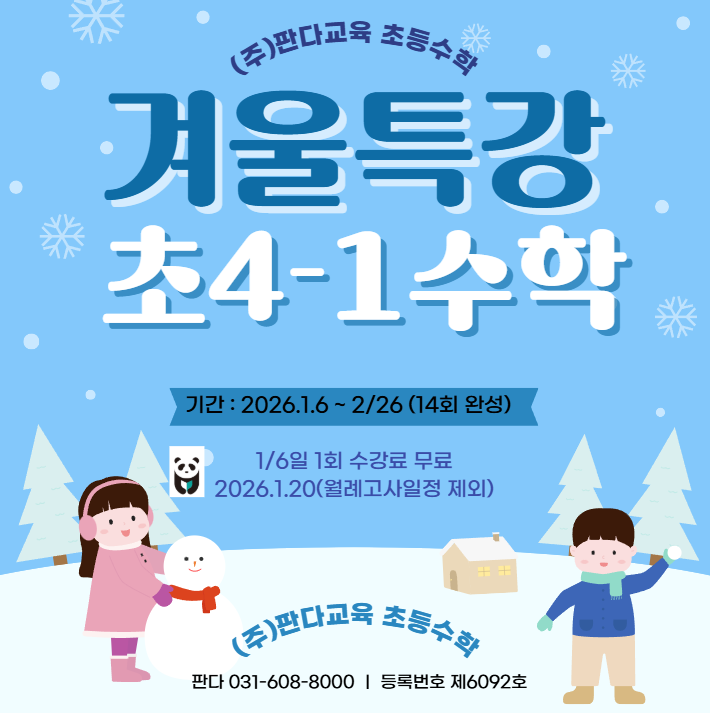 ❄️ 겨울방학, 초4 수학의 방향이 결정됩니다. 개념을 놓치면 5·6학년은 따라가기만 합니다 초등 4학년은 ‘계산 연습의 학년’이 아니라, 수학 개념이 처음으로 구조화되는 시기입니다. 이 시기에 개념이 흔들리면, 고학년에서 아무리 문제를 풀어도 성적은 안정되지 않습니다. 판다교육은 방학을 미리 끝내는 시간으로 씁니다. ‘선행’이 아니라 개념 완성이 목표입니다. 예비 초4 겨울방학 수학 특강 (2개월 완성과정) 강사: 남고경 T 교재: 초등 4-1 라이트쎈 대상: 초4-1 수학 개념을 처음부터 정확히 완성하고 싶은 학생 수업 시간: 화·목 오후 3:30 ~ 6:00 총 회차: 14회 (1월 20일 월례고사일 제외) ✔️ 이 특강이 필요한 학생 문....... <img src="https://blogthumb.pstatic.net/MjAyNTEyMjZfMjMw/MDAxNzY2NzI1MDY4NDYx.C01BleUCbIJ2mhgtOOTj7hE7VG4Kg6NqI-vNrk01vucg.7vh4h0h89Ks7yYxCH7dnQPZrNXTplcPxz37rqf9e7MMg.PNG/image.png?type=s3" />
