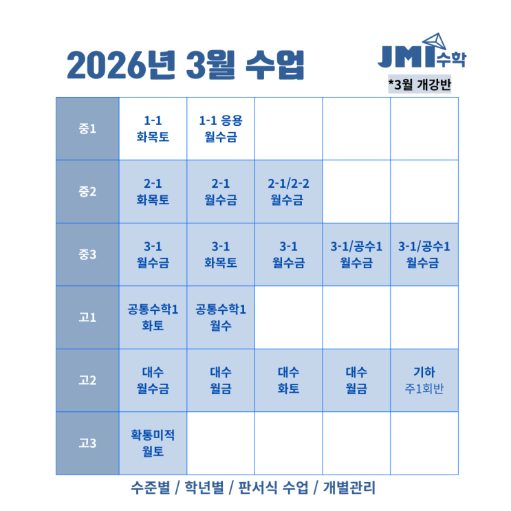 새학기가 시작되었습니다. 새학기 수학을 아직 준비하지 못한 학생!! 어서오세요!! 방학 동안 새학기 수학을 공부한 학생들은 어땠었나요? 다시 한번 들여다 보면 잊은 부분도 있을테고, 다음어 지지 않은 부분도 있을 수 있습니다. 3월부터 시작하는 반에서 다시 한번 더 공부하면서 심화문제까지 다져 나가야 할 때입니다. 중등부는 현행에 집중하는반도 있고 다음 학기와 현행을 병행하는 반도 있습니다. 레벨별로 나와 맞는 반에서 수업을 할 수 있으니 언제든 문의주세요! 고등부는 새학기와 함께 1학기 내신준비에 들어갑니다. 대부분 4월 말에 중간고사가 있어 중간고사에 맞추어 3월 4월 내신대비가 진행됩니다. 기하 수업은 수요일 / 토....... <img src="https://blogthumb.pstatic.net/MjAyNjAyMjdfMTEz/MDAxNzcyMTg4MjcwOTcz.jyIXjIc8RXLwe5VhiixYWWG8iaOwpR_6PE0VgaYKkusg.HZ4keADgbNKSFmziojj-wMGMv4yvUq5SXZMYjX8B3Hgg.PNG/_%BB%F3%B4%E3%BD%C7_.png?type=s3" />