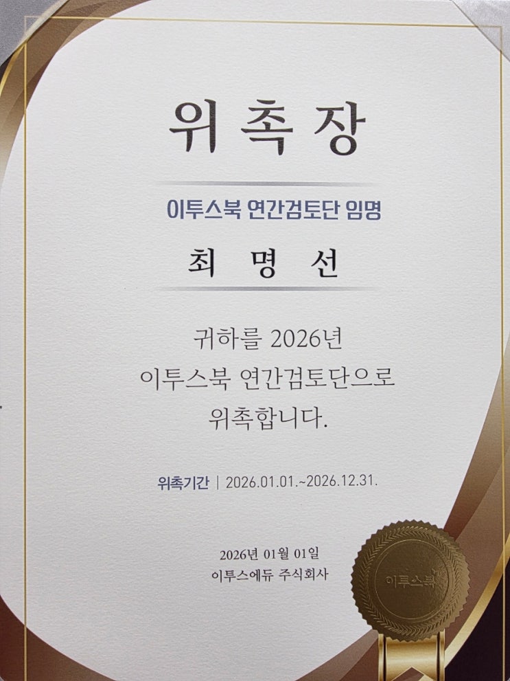 반가운 소식을 전해드립니다. 분당에서 십수년간 영어내신, 수능 강의를 하고있는 제가 기존 올바른선생님연합 검토위원에 이어 2026년 이투스 연간검토단에 임명되었습니다. 앞으로 더욱 열심히 교재연구를 통해 학생들에게 많은 도움을 주는 선생님이 되겠습니다 <img src="https://blogthumb.pstatic.net/MjAyNTEyMDdfMjg1/MDAxNzY1MTA4NjAzNjc4.u99EJ9ks7fRGN7Bc5SOBiTDiMJ1ilnzo_eYCmq3CfIQg.wJkM2zCRUW2BnqnHWYa8zC8QwNpw1W1DWESy2NWAqZ8g.JPEG/900%A3%DF20251205%A3%DF134739.jpg?type=s3" />