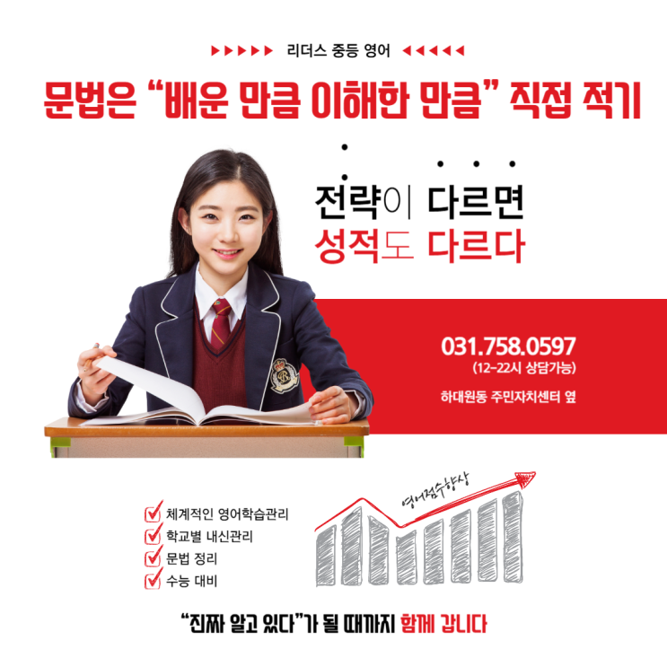 우리 학원의 중등 영어 수업이 어떻게 다른가? 안녕하세요. 성남시 중원구 하대원 리더스 영어입니다^^ 오늘은 학부모님들이 가장 궁금해하시는 부분을 알려드릴게요. 1. 결론부터 말하면, 리더스 영어는 ‘관리형 시스템’입니다. 그날 배운 단어, 문법을 바로 이해하고 바로 체크합니다. ✔ 단어는 하루마다 개수는 달라도 절대 빠짐없는 합격/불합격 체크 ✔ 채점 선생님 → 담임 선생님에게 바로 전달 ✔ 불합격 시, 학원 남아서 재시험 → 그날 완전히 끝내기 ✔ 문법은 그날 배운 개념을 ‘본인이 이해한 만큼’ 직접 적고 책에 붙이기 이 시스템 덕분에 아이들이 외우는 척, 대충 넘어가는 일 없이 정말로 ‘자기 머릿속에 남는 영어’를....... <img src="https://blogthumb.pstatic.net/MjAyNTEyMDhfMTcw/MDAxNzY1MTk0MTg5OTgx.wjgQl3-TGgZxEA9i9mFqaH_1JZPDxGzkqvORU3vkAYAg.Ukfk0FkV7xC2ZZlmHbXY0-vZitP-uXiehUy581fBEwUg.PNG/KakaoTalk_20251208_134342562.png?type=s3" />