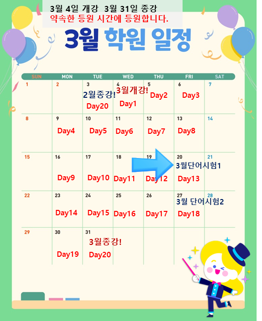 [공지] 내일은 두근두근 '영단어 콘테스트' 날입니다! 안녕하세요, 학부모님! 삼성영어셀레나 은행초교실 헬렌입니다 우리 아이들이 그동안 차근차근 쌓아온 실력을 확인하는 영단어 시험이 내일 진행됩니다. 단어 공부가 단순한 암기를 넘어 아이의 영어 자신감을 결정짓는 중요한 열쇠인 만큼, 가정에서도 따뜻한 격려와 함께 준비할 수 있도록 지도 부탁드립니다. 왜 영단어 공부가 그렇게 중요한가요? (3가지) 언어의 '벽돌' 역할: 집을 지을 때 벽돌이 필요하듯, 단어는 문장을 만드는 가장 기초적인 재료입니다. 단어를 모르면 읽기, 듣기, 쓰기가 모두 멈추게 됩니다. 문맥 파악의 핵심: 문법을 조금 몰라....... <img src="https://blogthumb.pstatic.net/MjAyNjAzMTlfMjEz/MDAxNzczOTI1MjQ1ODE0.-iBk4BQG4sBrMEGIVb1z8DhxV4hO0Q_36Mrv5BcjzSgg.HTZcc94zytxNFfmYsZgjJ59v3PKCBp9qY7nklHe30dog.PNG/KakaoTalk_20260319_213_3%BF%F9_%C0%BA%C7%E0%C3%CA%B1%B3%BD%C7_%C7%D0%BF%F8%C0%CF%C1%A4.png?type=s3" />
