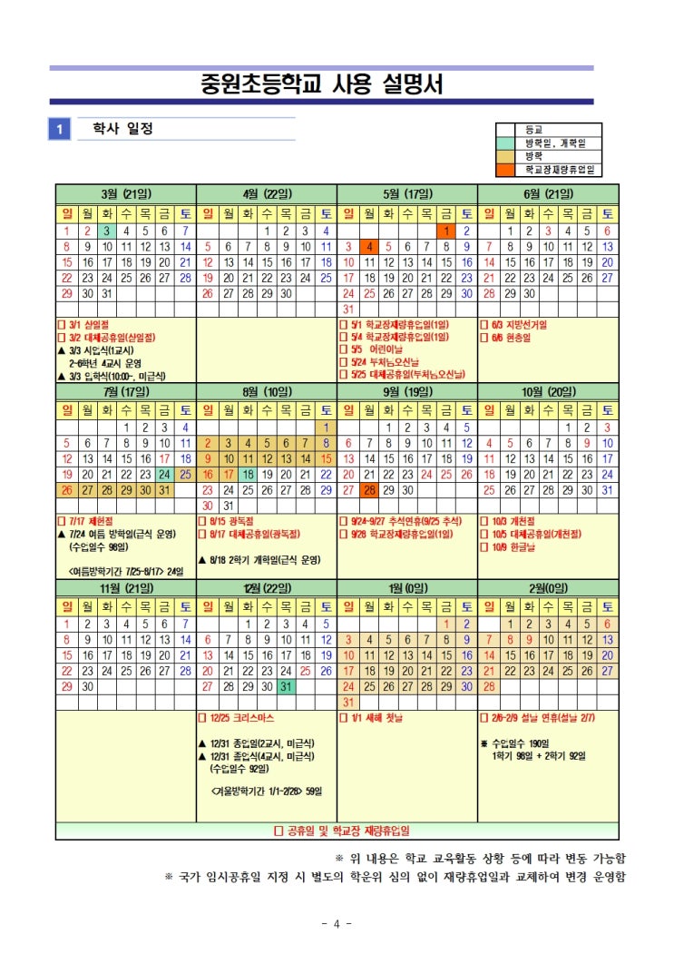 중원초등학교 2026년 학사일정 주요사항 안내 5월 주요행사안내 1일(금) 학교장 재량 휴업일 4일(월) 학교장 재량 휴업일 5일(화) 어린이날 25일(월) 대체휴일 6월 주요행사안내 3일(수) 지방선거일 7월 주요행사안내 17일(금) 제헌절 공유일 24일(금) 여름방학식 여름방학 기간 7/25~8/17 (총 24일) 8월 주요행사안내 17일(월) 광복절 대체휴일 18일(수) 2학기 개학 9월 주요행사안내 24일(목)~27일 추선연휴 28일(월) 학교장재량휴업일 10월 주요행사안내 5일(월) 대체휴일 9일(금) 한글날 12월 주요행사안내 25일(금) 성탄절 31일(목) 종업식&졸업식 2026년 1학년 시간표(중원초) 월 화 수 목 금 5 5 4 5 4 각 숫자는 교시를 의미합니다. ....... <img src="https://blogthumb.pstatic.net/MjAyNjAzMTZfMTk0/MDAxNzczNjY0MzU2Nzc1.ajp5N6jZNZmhX4jY8pS3QIh4xWVOeeTLliVBoLKpSg4g.jeVDSCDQUMjlgj6Vl5nZBHslwzdlRxo7PclRz4PqLQog.JPEG/%C1%DF%BF%F8%C3%CA.jpg?type=s3" />