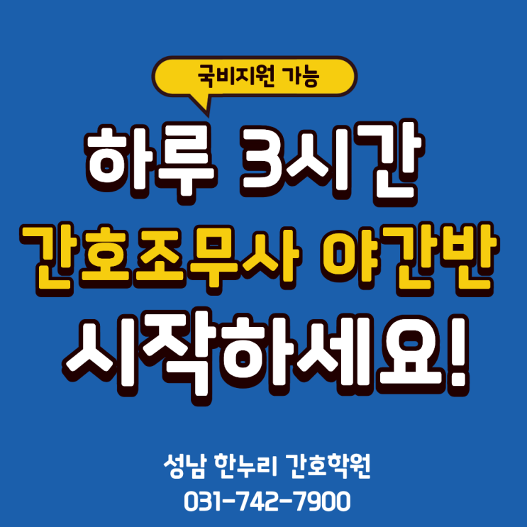 하루 3시간 투자로 간호조무사 자격증 취득하세요! (+15만 원 상당 혜택까지?!) 낮 시간에는 도저히 학원에 갈 수 없어서 직장 때문에 시간 맞추기가 어려워서 아이 돌보느라 주간반은 현실적으로 힘들어서 이런 고민 때문에 미루고 계신 분들이 많습니다. 하지만 성남 한누리 간호학원에는 이런 분들을 위해 #간호조무사국비지원야간반이 있습니다! 이런 분들에게 특히 추천드려요! 낮에는 직장을 다니는 직장인 육아와 집안일로 낮 시간이 어려운 분 경력단절 후 다시 자격증을 준비하는 분 새로운 직업을 준비하고 싶은 분 지금이 가장 빠른 때입니다. 하루 3시간, 무리없이 시작하세요! 성남 뿐만 아니라 분당, 판교, 광주, 위례, 송파에서도....... <img src="https://blogthumb.pstatic.net/MjAyNjAzMTZfMjcw/MDAxNzczNjI3NzkxNzE1.fOJAxIKbdBC10muL9VYMh5bJL5vsoe_ZrZjrzeO6he0g.cjt7G8m1b27SA_GXnrWt7p4WWU62ZIYb02VLG0kzBUog.PNG/1.png?type=s3" />