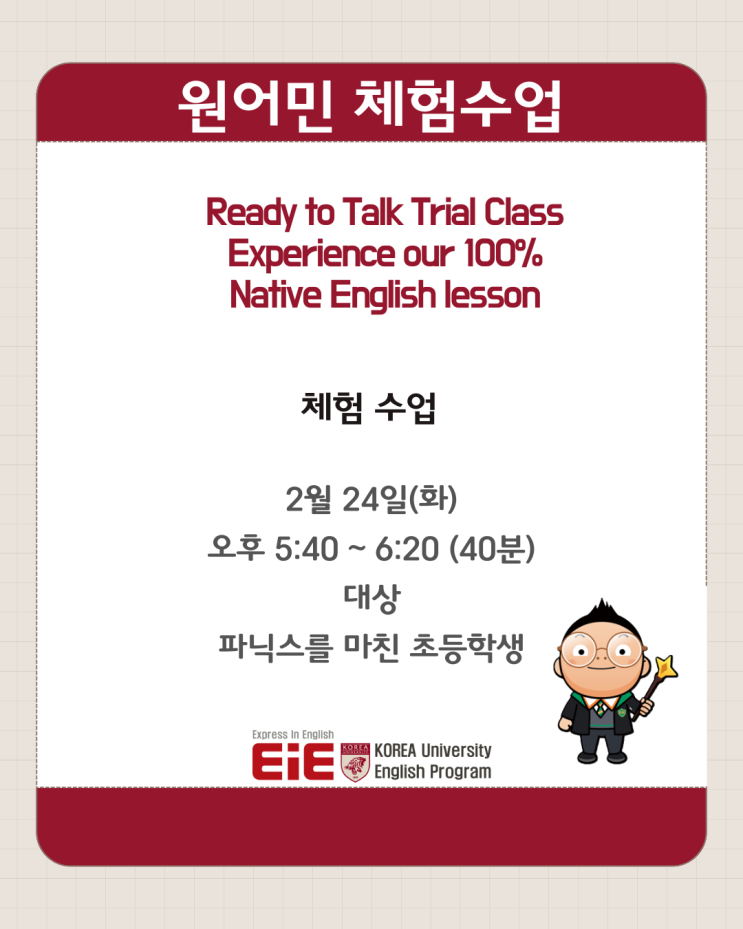 우리 아이 영어 학원, 알아보고는 있지만 결정이 쉽지 않으신가요? 새로운 수업에 잘 적응할 수 있을지 걱정되신다면— EiE 성남금광에서 100% 원어민 통합 수업 ‘Ready to Talk’ 정규 수업을 그대로 경험해볼 수 있는 체험 수업을 준비했습니다. ✔ 우리 아이가 수업을 잘 따라가는지 ✔ 영어 수업을 부담 없이, 재미있게 느끼는지 ✔ 말하기 활동에 자연스럽게 참여하는지 ✔ 수업이 실제로 어떤 방식으로 진행되는지 를 직접 확인하실 수 있습니다. 체험 수업 : 2월 24일(화) 오후 5:40 ~ 6:20 (40분) 대상 파닉스를 마친 초등 신규 학생 100% 원어민 선생님과 함께하는 ‘Ready to Talk’ 체험 수업 신청 방법 사전 예약제로 진행됩니다. 아....... <img src="https://blogthumb.pstatic.net/MjAyNjAxMTFfMTYw/MDAxNzY4MTM0NTE1NTM0.mhm24ceICfVdeAlN9F-h8Z0rJYqAWU1M8ZtIs01GWbUg.yOrZ-QOMChIiq0Oma3u-Yhh3WvnF1yAmsCqE4cS6zXog.PNG/EiE_%BC%BA%B3%B2%B1%DD%B1%A4_100_%BF%F8%BE%EE%B9%CE_%C8%B8%C8%AD%B9%DD_GRAND_OPEN_%281%29.png?type=s3" />