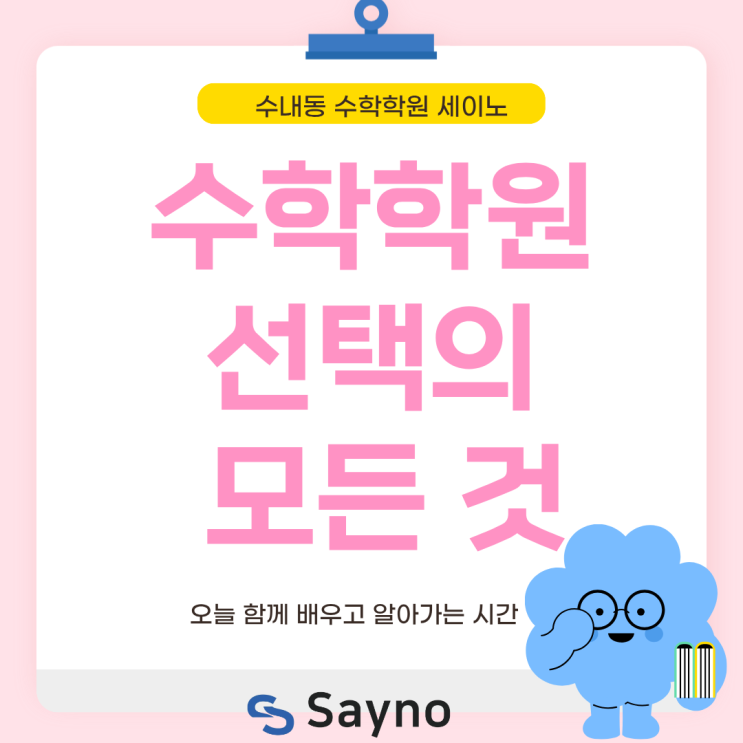 요즘 수내동 수학학원을 찾다보면 , 수학학원 선택지는 참 많지만 정작 우리 아이를 믿고 맡길만한 곳은 찾기가 어렵습니다. 대형학원은 체계적인 커리큘럼이 좋지만 혹시 우리 아이가 진도에 치여 들러리가 되진 않을까 걱정되고, 작은 학원은 관리는 잘 되지만 가르치는 강사의 실력이나 수업내용이 부족하진 않을까 망설여지시죠. 수내동 초등수학학원 세이노에선 더 이상 이런 고민이 필요없습니다. 세이노는 이렇게 달라요~ 첫째 세이노에선 단순히 진도만 빨리 나가는 문제풀이 수업을 하지 않습니다. 아이가 연산에서 막히는지, 문장제 문제에서 핵심을 놓치는지, 어떤 지점을 어려워하는 지 세밀하게 찾아내어 채워줍니다. 대형학원의 체....... <img src="https://blogthumb.pstatic.net/MjAyNjAyMTBfMTk3/MDAxNzcwNzEwMjE2NTI3.HcahLd4LWn4hi46dENbmbdYi0P_ia0kkx1lRc2Qm9Qwg.azBAysTt902buDPRHKgA2fn1M6YBanTWTy6nsamY36Ug.PNG/%BB%E7%BA%BB_-_1.png?type=s3" />