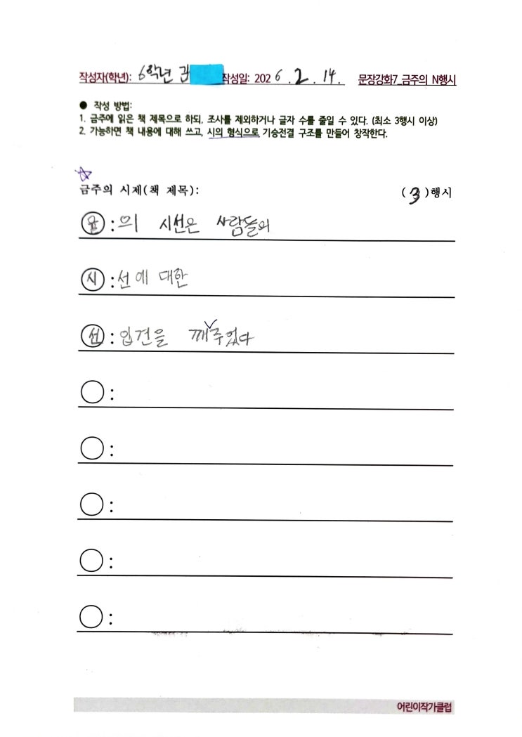 "안녕하세요. 어린이작가클럽 논술교습소 수업이야기를 공유합니다. 분당·판교 지역에서 소수정예로 운영되는 글쓰기 전문 논술교습소입니다." 또 하나의 독서 기록, 금주의 N행시! 어린이작가클럽에서는 매주 독후논제글쓰기를 하는 한편 <금주의 N행시>을 작성하고 있습니다. 이는 또 하나의 독서 기록이며 문장강화활동이지요. 작성 방법은, 읽은 책 제목으로 운을 잡되, 조사를 제외하거나 글자 수를 줄일 수 있습니다. (최소 3행시 이상) 그리고 가능하면 책 내용에 대해 쓰고, 시의 형식으로 기승전결 구조를 만들어 창작합니다. 자투리 시간을 이용해 써 보는 N행시가 때로는 산문보다 깊은 울림과 메세지를 주기도 합니....... <img src="https://blogthumb.pstatic.net/MjAyNjAyMTRfMTkg/MDAxNzcxMDUzMjgwNjQ3.0EZkgeOnjvstriCN55KGGgjmgublKZirS8-dtMs4evUg.PafrPHbINHalR092-7Lj4qecQejppQAK75bl8BxRfPsg.JPEG/KakaoTalk_20260214_155738900.jpg?type=s3" />