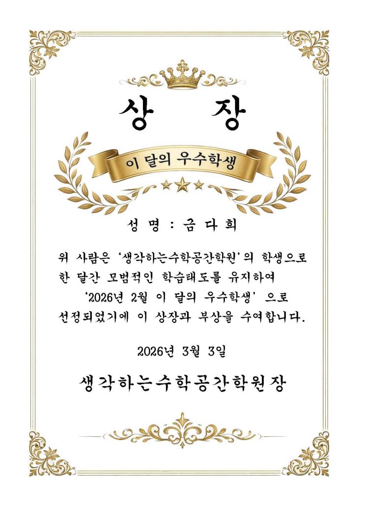 안녕하세요, 스스로 고민하고 스스로 답을 찾아가는 "생각하는 수학공간"입니다. 유난히 춥고 짧았던 2월이었지만, 우리 생수공 아이들의 학습 열기는 그 어느 때보다 뜨거웠습니다. 겨울방학 동안 쌓아온 탄탄한 기초가 새 학기의 자신감으로 이어질 수 있도록, 묵묵히 자신의 자리를 지킨 2월의 주인공들을 소개합니다! "수학 실력은 계단식으로 성장합니다. 2월 한 달간 여러분이 흘린 땀방울은 지금 당장 눈에 띄지 않더라도, 3월 새 학기 첫 수업 시간에 분명 큰 힘이 되어줄 거예요. 끈기 있게 버텨준 우리 학생들, 정말 대견합니다!" 수학이 단순한 계산이 아닌, 즐거운 탐험이 되는 곳. 3월에도 생각하는수학공간은....... <img src="https://blogthumb.pstatic.net/MjAyNjAzMDNfMjc1/MDAxNzcyNTI5MzY4Nzg5.i5L6ajTvgfPIWoKwlkZgeZWVlCsFb_wdDHHF4srbnZ8g._lql5cavkEZa6iiSrYCTu7U4ldEYn_VIDpFI-hIk1r4g.JPEG/%B1%DD%B4%D9%C8%F1.jpg?type=s3" />