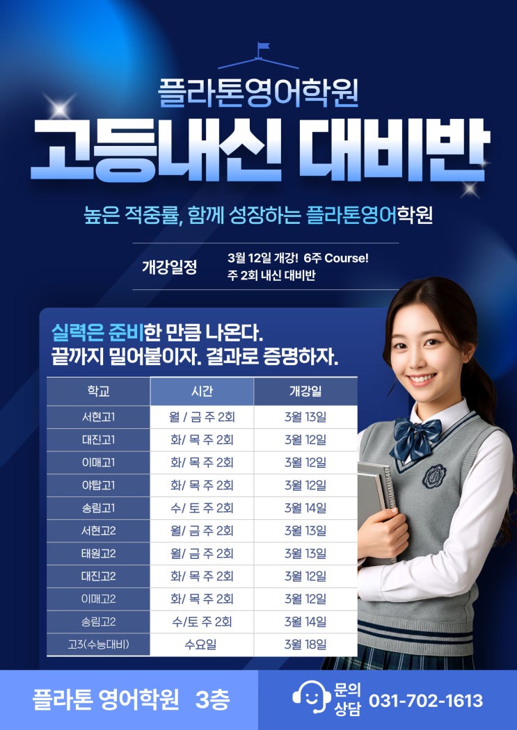 "혼자 하면 걱정, 함께 하면 확신" 플라톤 영어학원 고등 내신 대비반 개강 안녕하세요, 서현동 영어학원 플라톤 영어학원입니다. 새 학기의 설렘도 잠시, 훌쩍 다가온 첫 시험 소식에 우리 아이들의 어깨가 조금 무거워 보이지는 않나요? "이번 시험, 잘 할 수 있을까?" 불안해하는 아이들에게 가장 필요한 건 '할 수 있다'는 믿음과 정확한 길을 보여주는 선생님의 진심입니다. 실력은 준비한 만큼 나옵니다. 아이들의 노력이 헛되지 않게, 서현동 영어학원 플라톤영어학원은 3월 12일부터 6주간의 내신 집중 코스를 시작합니다. [학교별 맞춤 시간표 안내] "끝까지 밀어붙이자. 결과로 증명하자.&quo....... <img src="https://blogthumb.pstatic.net/MjAyNjAzMDNfMjg3/MDAxNzcyNTIwODgxMzcz._rknnAPkuYLFscdB8N04nEA_3CIKLsndWKBuLhnKCOsg.y4uKLJ3pzKYObdfS843P5nI47TXXf7NNMLWU-5yR8X4g.JPEG/%B0%ED%B5%EE%B3%BB%BD%C5%B4%EB%BA%F1_%BD%C3%B0%A3%C7%A5.jpg?type=s3" />