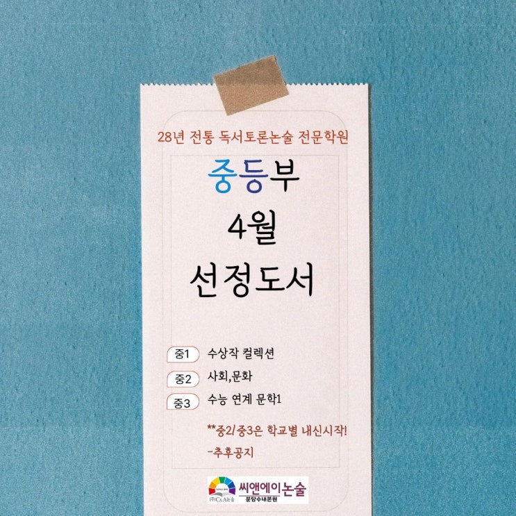 2026년 4월 분당씨앤에이논술학원 중등부 선정도서 목록입니다 2026년 4월 중등부 선정도서 목록입니다. <img src="https://blogthumb.pstatic.net/MjAyNjAzMDdfMTU3/MDAxNzcyODUyNzk2NTI4.Tz9Mq1CluuZd22Vpwn412s_spk2cTZPR8GZ1w_FfPo0g.auvefRGjQeogjYdvf9wfR-kBe3E95URQ5tCkGxdfLmEg.JPEG/4.jpg?type=s3" />