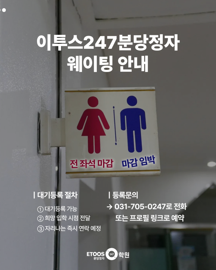 독학재수학원 이투스247 분당정자점 웨이팅 안내 ▪️대기등록 전화 031-705-0247 ▪️등원 희망시점 전달 ▪️자리나는 즉시 연락 예정 남학생 등록 마감 임박!!!!! 공부할 준비가 돼있는 N수생이라면 빠르게 문의하기 여학생 전 좌석 마감 - 대기등록 가능! 많은 관심을 가져주셔서 감사합니다 현재 대기 등록 접수만 가능합니다! 대기 걸어두시면 가장 먼저 연락을 받으실 수 있습니다 :) *대기 등록은 등록 확정이 아닌 ’좌석 발생 시 우선 안내‘ 접수입니다. ⭕️등록 절차 1. 031-705-0247 학원으로 전화 2. 등록 접수 의사 밝히고, 희망 등원 예정일, 희망 좌석 전달 (특정일 또는 자리 나는 대로/특정 좌석, 빈 좌석) 3........ <img src="https://blogthumb.pstatic.net/MjAyNjAyMjdfMTc3/MDAxNzcyMTUwNjgyMjM3.lhvJibr00ZXiu92-CCLv5HhNrbbLpuLxBK-ybFbC8_4g.o3G9QL6hQvnUkNQA9lQJJ0xF2as6Ks53d3VOsVG8trIg.PNG/%B8%B6%B0%A8%B0%F8%C1%F62.png?type=s3" />