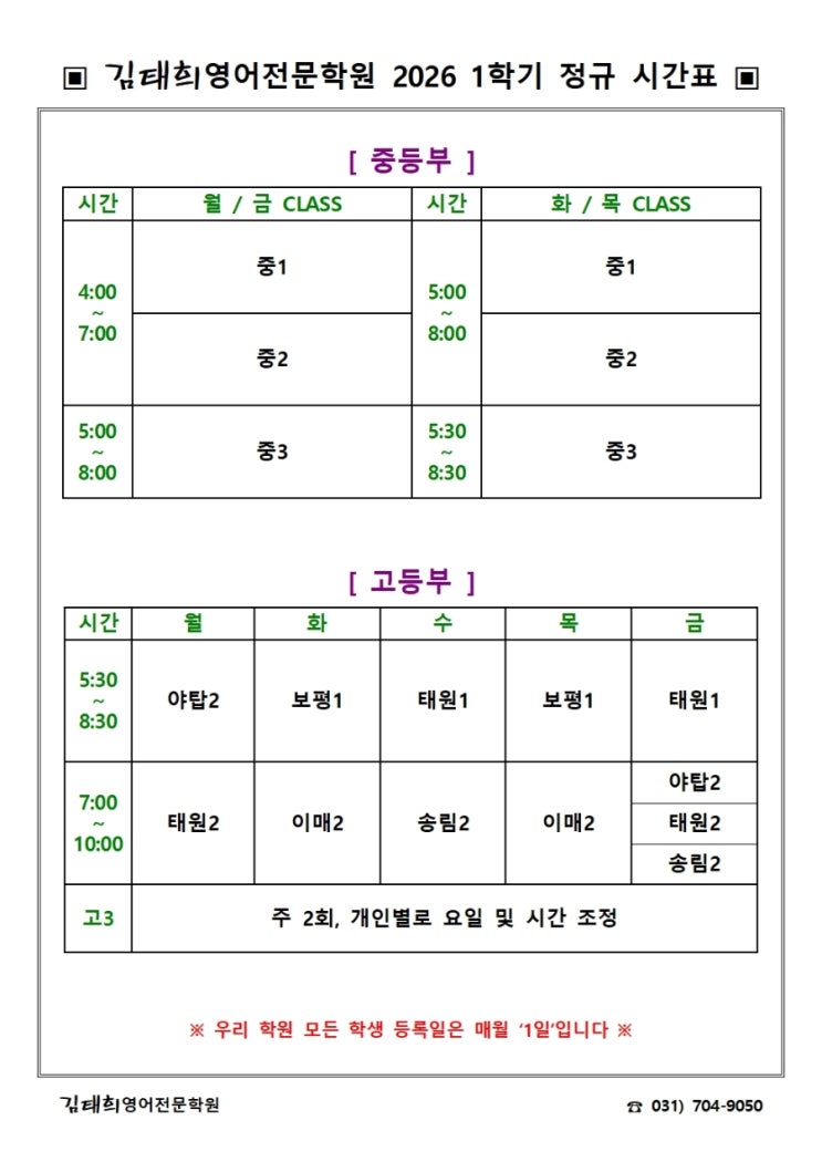 안녕하세요. 김태희 영어학원입니다! 2026 1학기 정규 시간표 안내드립니다. 중간고사 대비 일정은 학교별 학사일정이 나오는대로 안내드릴 예정입니다. 관련해서 문의내용은 평일 오후 3~10시 학원(031-704-9050)으로 상담전화주세요! <img src="https://blogthumb.pstatic.net/MjAyNjAyMThfMjI3/MDAxNzcxMzkzMjY4MTAz.nbsgNZiS_NqdOp2ZLojd64VhO_bEMvYjMBSx11sRDSMg.4TTZffb1nVIY3ggP3g3I-Orsn-69Z5xKBL2vPYPMHGsg.JPEG/900%A3%DF1771234314951.jpg?type=s3" />