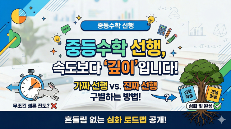 "우리 아이 친구는 벌써 중3 진도를 나간다던데, 우리 아이만 늦은 건 아닐까요?" "선행을 하긴 했는데, 막상 학교 시험을 보면 점수가 안 나와요." 최근 수이학원에 상담 오시는 중학생 학부모님들께서 가장 많이 토로하시는 고민입니다. 주변의 빠른 선행 속도를 들으면 당연히 불안해지실 수밖에 없죠. 하지만 객관적인 현실을 말씀드리자면, '속도'에만 집착한 선행은 고등학교 진학 후 100% 무너집니다. 오늘 수이학원에서는 학부모님들이 가장 궁금해하시는 올바른 중등수학 선행의 기준과 확실한 학습 로드맵을 명확하게 짚어드리겠습니다. 중등수학 선행, 왜 '구멍'이 생길까요? 중등 수학은 초....... <img src="https://blogthumb.pstatic.net/MjAyNjAzMDNfMjUw/MDAxNzcyNTI1MzcxODc1._vrJ5wKeZLlnyb2s1g5GYwDnJ58AwO0vwk0q_Y03ZQAg.Iqctp5o3B8Emic34hvLN2nFKibiatKHl36d8DNTf3sog.PNG/Gemini_Generated_Image_lid0x8lid0x8lid0.png?type=s3" />