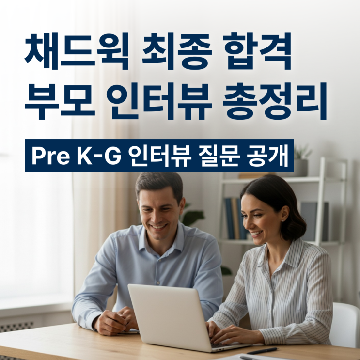 안녕하세요, 어라운즈 아카데미 제이슨 원장입니다. 지난 글에서 전해드린 것처럼 2026학년도 채드윅 국제학교 Pre K–G1 1차 전형에서 우리 어라운즈 학생들 전원이 합격하는 기쁜 결과가 있었습니다. 하지만 채드윅 입시는 여기서 끝이 아닙니다. 채드윅 최종 합격 여부는 ‘부모님 인터뷰’로 결정됩니다. 지금은 부모님 인터뷰를 집중적으로 준비하셔야 할 때입니다. 왜 부모님 인터뷰가 중요한가 이 시기의 아이들은 아직 어리기에 학교는 아이의 영어 실력이나 시험 점수보다 가정의 방향성과 교육 철학을 더 깊이 봅니다. 2차 전형에서는 학생 평가와 부모님 인터뷰가 본격적으로 진행되기에 이 시점에서 중요한 것은 정확한 방향을 가지....... <img src="https://blogthumb.pstatic.net/MjAyNjAyMjdfMjgg/MDAxNzcyMTc4ODU3MTIy.uCUjNxqvIZl9Y6Rr8i3FTTpiEG_7NWwFc8kUgqpIdG4g.VjmWeCi4GJVYkWj5JGgo5uR9WUwgfELt7bH8EueqFN4g.PNG/%C3%A4%B5%E5%C0%A8_%BA%CE%B8%F0_%C0%CE%C5%CD%BA%E4.png?type=s3" />