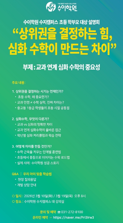 [설명회] 수지캠퍼스/ 초등 학부모 대상 설명회 “상위권을 결정하는 힘, 심화 수학이 만드는 차이 ”