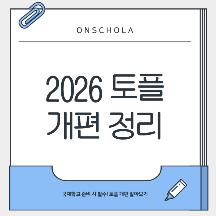안녕하세요~! 눈 깜짝할 새에 벌써 3월이 찾아왔어요 3월은 새로운 도전과도 어울리는 달인만큼 유학, 토플 등을 준비하는 분들도 많을 것이라고 생각이 됩니다ㅎㅎ 그래서 오늘은 국제학교 온라인스쿨 최강자 온스콜라가 이번에 새로 바뀐 토플 개편에 대해 알려드리려고 합니다 국제학교 학생들에게도 토플은 필수이기도 하죠~ 물론 SAT 점수나 Lang Waiver도 있지만 미국 거주가 아닌 외국인 유학생으로서 English Proficiency Waiver는 진짜 진짜 대학마다 다른 부분이라서요~ 모든 시작에는 신비한 힘이 깃들어 있어 우리를 지켜 주고 살아가도록 도와준다는 말이 있듯이 우리 함께 힘차게 시작해 볼까요? 모든 새로운 시작에는 신비한 힘이....... <img src="https://blogthumb.pstatic.net/MjAyNjAzMDRfMTQ4/MDAxNzcyNjI1NTAxMDA1.tE7VrG7vYmAFqoxAB3mPVykpDZ68Oa6MZ_AtuqnJ8xkg.lY9m9kK8Sp3ihsviPNo3HWHed1igW885sWUVz1U67IAg.PNG/%C1%A6%B8%F1%C0%BB_%C0%D4%B7%C2%C7%D8%C1%D6%BC%BC%BF%E4._%2847%29.png?type=s3" />