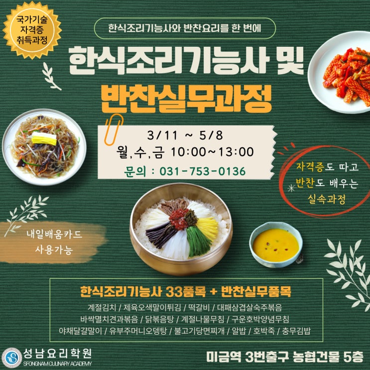 한식조리기능사 자격증에 관심은 있지만 맛있는 반찬도 만들고 싶은 분들이라면? 두 가지를 모두 잡을 수 있는 과정이 있습니다! 한식조리기능사 및 반찬실무과정 3/11 개강 분당 성남요리학원에서는 한식조리기능사 실기 33품목 메뉴 실습과 함께 실생활에서 활용할 수 있는 한식 반찬요리까지 배우는 수업을 준비하였습니다. 가끔 학원으로 상담 오시는 분들 중에는 이렇게 이야기하시는 분들도 계셨습니다. "한식조리기능사 시험 메뉴는 맛이 별로라던데요~~" 그래서 취미 요리를 배울지 아니면 이왕 학원을 다니는 김에 자격증 과정을 배울지 고민하시는 경우가 종종 있었는데요, 그런 아쉬움을 달래드리려고 특별히 개설한 과정이....... <img src="https://blogthumb.pstatic.net/MjAyNjAzMDVfMjI1/MDAxNzcyNjcyMzUyNjgx.nntEm-l35lAn88CqLwapbJAoX4mp-GromCIjgAEWbpYg.Ux-uB2_rq1Xw5iuQ6vc6efkdPJeY9Zta0tjm8l6mxwMg.JPEG/%C1%A6%B8%F1%C0%BB-%C0%D4%B7%C2%C7%D8%C1%D6%BC%BC%BF%E4_-016_%283%29.jpg?type=s3" />