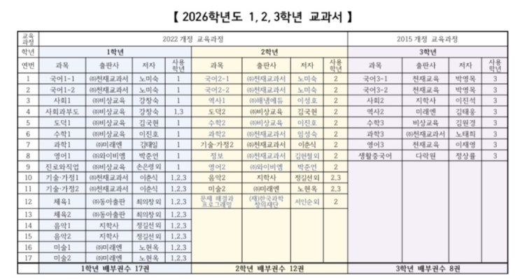 2026년 구미중 교과서 목록