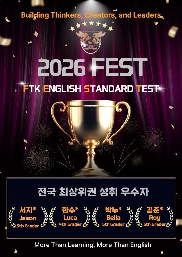 FEST는 단순한 시험이 아닙니다. 우리 아이의 현재 영어 실력을 객관적으로 진단하고, 강점과 보완점을 정확히 분석하여 앞으로의 학습 방향까지 구체적으로 제시해 주는 표준화된 영어 능력 평가입니다. 이번 2월 9일(월)과 2월 10일(화)에 진행된 전국 영어 능력평가 FEST 시험이 FTK 분당 본원에서 실시되었습니다. 그리고 드디어 성적이 발표되었습니다. 무려 전국 석차 10프로 안에 들은 성적 우수자 4명 배출! 시험을 치른 FTK 분당 본원 학생들의 전체 평균 점수 또한 매우 우수하게 나타났습니다. 전국 단위 평가에서 이처럼 뛰어난 결과를 만들어냈다는 것은 결코 쉬운 일이 아닙니다. 전국적으로 우수한 최고 점수자들이 우리 원에서 나....... <img src="https://blogthumb.pstatic.net/MjAyNjAyMjZfMjYz/MDAxNzcyMTA0NTI4NTg0.vGpzXo52g2HJrLMgOaiGQLQdlPM-0abwUSz9nxGxYggg.N3oWHui3XhBb7dQxnA3APsXhcysve-PQQ4NRbb5yFgQg.JPEG/FEST_Test_%BC%BA%C0%FB%BF%EC%BC%F6%C0%DA_%281%29.jpg?type=s3" />