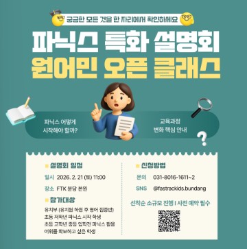 안녕하세요. FTK English 분당 본원입니다. 영어 학습을 처음 시작하는 시점은 아이의 학습 방향을 결정짓는 매우 중요한 시기입니다. 이 시기에 단기적인 성과에 집중하기보다, 우리 아이에게 맞는 방향을 설정하고 장기적인 학습 로드맵을 세워 차근차근 실행하는 것이 무엇보다 중요합니다. 이에 FTK에서는 영어 학습의 출발점이 되는 파닉스(Phonics)에 특화된 학부모 설명회를 진행합니다. 파닉스, 왜 중요할까요? 파닉스는 단순히 알파벳 소리를 배우는 과정이 아니라, 읽기(Reading)와 이해(Comprehension)의 성장을 좌우하는 핵심 기초 단계입니다. 이번 설명회에서는 다음과 같은 내용을 중심으로 안내드릴 예정입니다. ▶ 파닉스 학습....... <img src="https://blogthumb.pstatic.net/MjAyNjAyMTBfMjI5/MDAxNzcwNjg2NDkxMTQ3.elAwpo9IpcZ2tSLTSXNzfSdI5u-_71TXXHMWXc0gpAcg.EaUA6EFdMW0cCF5olOoKbsVHfMrbGGwvTkp14RUgDtsg.JPEG/%C8%AD%B8%E9_%C4%B8%C3%B3_2026-02-09_180143.jpg?type=s3" />