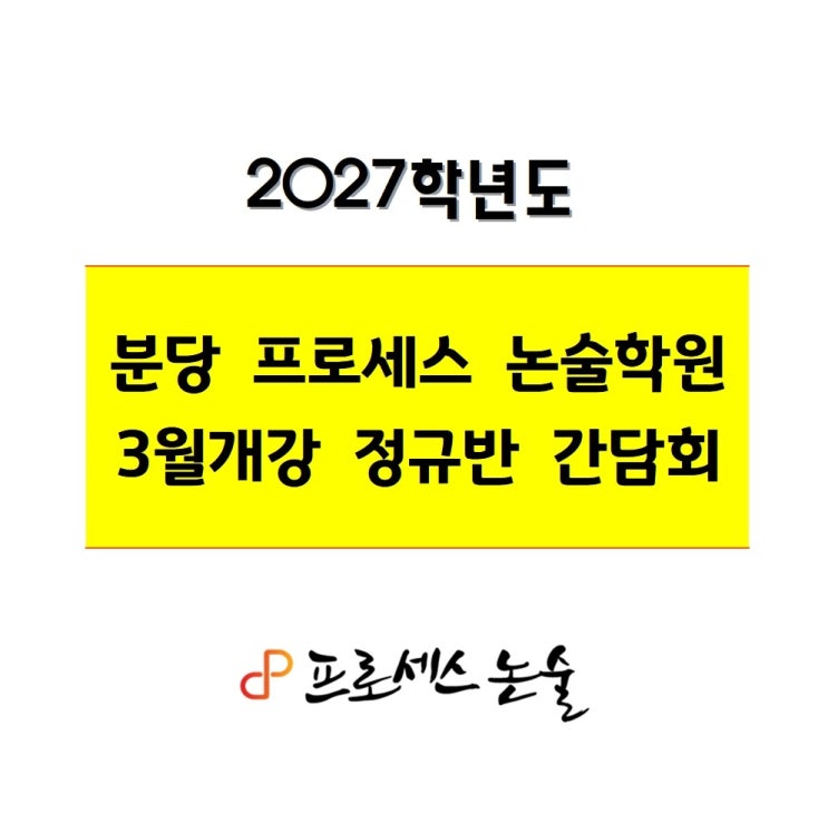 2027학년도 분당 프로세스 논술학원 개학 대비 간담회 2027학년도 고3 개학에 맞춰, 3월개강반 간담회를 마련하였습니다. 간담회에 참석하셔서 논술 전형을 중심으로 한 2027학년도 입시 전략에 대해 알아가셨으면 합니다. - 설명회 내용 - ○ 3월 개강 논술정규반 소개 ○ 2027학년도 수시 및 논술 전형 분석 ○ 2027학년도 수시 지원 전략 가이드 ○ 프로세스 정규반 프로그램 및 연간 학습 로드맵 안내 ○ 프로세스 논술 정규반 체제 및 학습 방향 소개 ○ 질의·응답 시간 - 일시 / 연사 - ○ 2/24(화) 오전 11시 / 양용범 분당 프로세스 원장, 황지우 전임강사 ○ 2/25(수) 오전 11시 / 양용범 분당 프로세스 원장, 장주은 전임강사 (두 타임....... <img src="https://blogthumb.pstatic.net/MjAyNjAyMTlfMTU2/MDAxNzcxNDc5OTI2ODE3.QykjGJ6ViJYTjhuNBYm0LPqgEuTFEEhhc3JDVu8Lgy8g.ucPOsRLiDf3kfP3qn48zwSeCKGfPTNHUVgECOAaO_aIg.JPEG/2027%BA%D0%B4%E7_3%BF%F9%B0%B3%B0%AD_%C1%A4%B1%D4%B9%DD_%B0%A3%B4%E3%C8%B8_%B9%E8%B3%CA%BF%EB001.jpg?type=s3" />