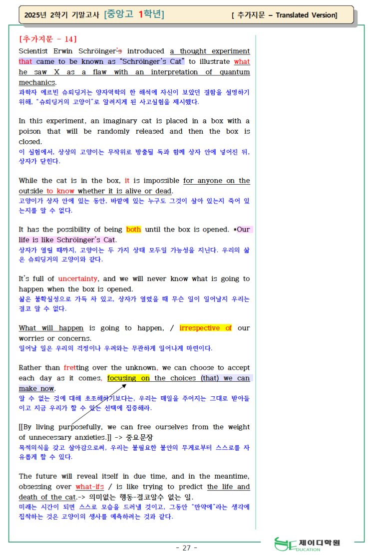 학생보다 먼저 잠들지 않는 학원, 제이디학원입니다. 제이디학원은 2013년부터 분당중앙고 영어 내신을 꾸준히 분석하고 준비해온 학원입니다. 많은 홍보보다는 실제 시험과 수업 결과로 신뢰를 쌓아왔고, 중앙고 내신의 출제 흐름과 변형 방식을 오랫동안 자료로 정리해 왔습니다. 광고보다 시험을 먼저 봤고, 홍보보다 자료를 먼저 만들어 왔습니다. 중앙고 내신을 깊이 있게 준비해 온 학생들과 학부모님들 사이에서는 '분당중앙고 내신을 정말 잘 아는 학원'으로 이어져 왔습니다. 효율적인 분당중앙고 내신 대비? 효율적인 중앙고 내신 대비란 수업 이후에 문제를 푸는 방식이 아니라 글을 이해하는 방식이 달라지는 것입니다. 분....... <img src="https://blogthumb.pstatic.net/MjAyNjAyMDJfNzAg/MDAxNzcwMDI0OTk5NjM1.UcX5REBZiROyUEmdnINmwoxXkzW71ErFfJIkTd5QnQog.81k1ptlsVyScEp0UtHWLrn083yTUY0AO0CIiHiSN6_Ag.PNG/3-%C7%D8%BC%AE%B9%F6%C0%FC001.png?type=s3" />