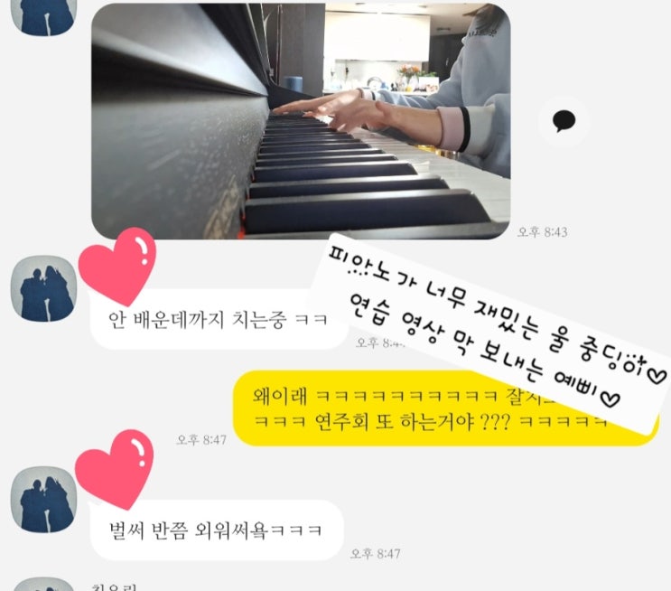 울 이쁜 중딩이♡ 집에서 피아노 연습 너무 해서 어머님이 혹시 선생님이 숙제 내줬냐고 물으시고 (저는 숙제 안내줘요) 다른 공부 다 해 놓고 연습 하냐고 물으시고~ 공부 다 해 놓고 치는 거라고 하니 그럼 맘껏 해 ~ 라고해서 진짜 맘껏 연습하고 나한테 자랑 카톡 보내고 담날 학원 와서 셀프 영상 까지 ❤️ 피아노를 사랑하고 연주의 즐거움을 느끼는 모습에 선생님은 오늘 도 엄마 미소 ^___________^ #분당피아노 #판교피아노 #분당음악학원 #판교음악학원 #백현마을피아노 #백현마을음악학원 #백현동피아노 #백현동음악학원 #신백현초피아노 #신백현초음악학원 #신백현중피아노 #신백현중음악학원 #알파리움피아노 #알파리....... <img src="https://blogthumb.pstatic.net/MjAyNjAxMzBfMjA5/MDAxNzY5NzgwNDA5ODkx.3gya-s9auDH2C4zLN_Os_TcdflwitCMQrJPGKApAD-Eg.MdwoDgH68B3ROU6FYACUSJQjnhR6RTi1DL7YDkh_Xc0g.JPEG/900%A3%DFScreenshot%A3%DF20260130%A3%DF223151%A3%DFKakaoTalk.jpg?type=s3" />