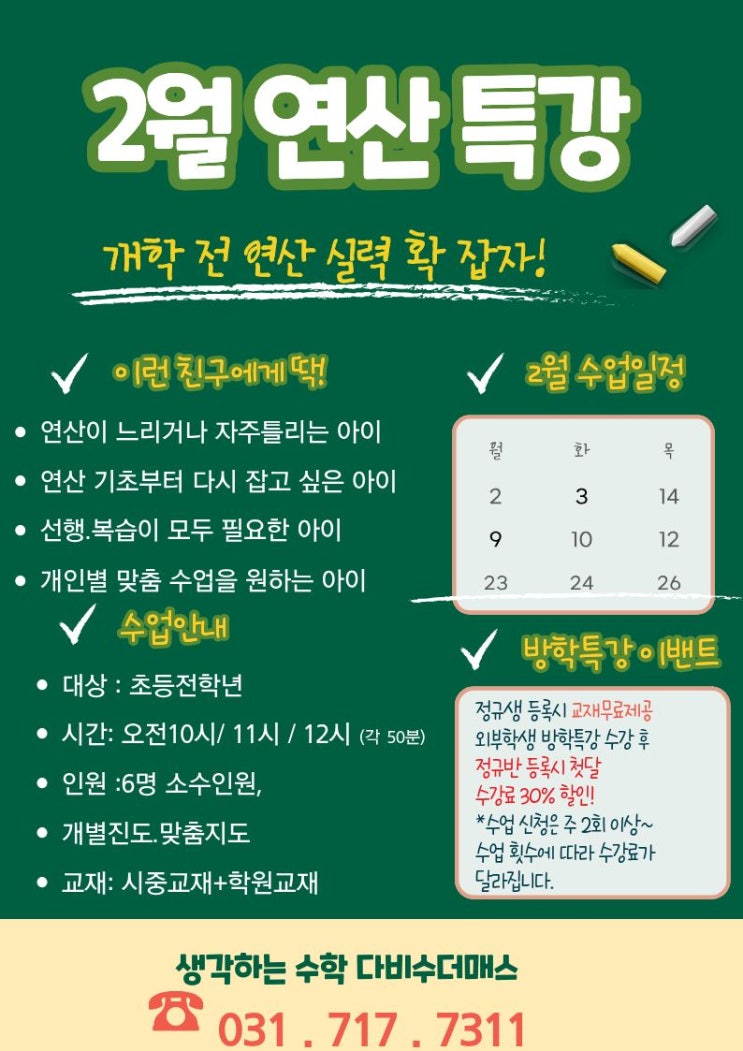 안녕하세요 다비수판교분당지사 향기샘입니다. 2월은 연산 정리하기 딱 좋은 달이에요^^ 겨울방학도 막바지, 이제 슬슬 새 학기 준비 얘기가 나오는 시기죠. 교과서 바뀌기 전, 진도 나가기 전, 연산만 한 번 정리해도 새 학기 수학이 훨씬 편해집니다. 그래서 다비수더매쓰 분당지사에서는 2월 연산 특강을 진행하고 있어요 2월 연산 특강, 이런 점이 달라요 연산 특강이라고 해서 무작정 문제만 많이 푸는 수업은 아니에요. 아이마다 ✔️ 느린지 ✔️ 자주 틀리는지 ✔️ 개념이 헷갈리는지 다 다르기 때문에 현재 수준부터 확인 → 맞는 단계로 수업합니다. 이런 친구들에게 추천해요 ✔️ 계산 속도가 느린 경우 쉬운 연산에....... <img src="https://blogthumb.pstatic.net/MjAyNjAyMDFfNDMg/MDAxNzY5OTM2Nzc2MTg0.bWvdm-9mIyIO_69JrHV48FVm_5Wzm9Ocwc2MEJgOZK8g.UwLvY7jzxijzRit7WdAlev1kVAegHdIiwuZyWXX5rOIg.JPEG/1769900859785.jpg?type=s3" />