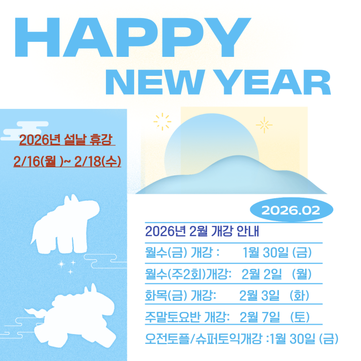 ❤️2026년 2월 개강 수업 및 등록혜택 안내 ❤️ 월수(금) / 슈퍼토익/ 토벤져스 정규 A&B반 개강 : 1월 30일 ( 금) 월수(주2회) 개강: 2월 2일 (월) 화목(금) 개강: 2월 3일 (화) 주말토요반: 2월 7일 (토) ‼️2월 설날휴원합니다 (2/16(월) ~2/18(수)‼️ ***반별 상이 하니 한번더 확인은 데스크로 해주세요 :) [대표번호: 1666-1530]*** ✅슈퍼토익.로키토익.피터토스 토익삼콤보 2월 수업 얼리버드 등록 시작합니다! (1/21일까지) 최대 15% 할인은 놓쳐서는 안되니 잊지마시고- 해설이 있는 모의고사! --->등록은 1/21일까지 (9,900원) ✅토플토플 토플! 뉴토플 늦게오지말기 **************월수금반 마감 ******************* 뉴....... <img src="https://blogthumb.pstatic.net/MjAyNjAxMTZfMjUz/MDAxNzY4NTY1NDUxMzI0.pAR0CiaLD9N_Vh1zw7GxQhmTa5amxzJ2iFFTczaK5scg.8uJFOyJzhwNXur1Hx2gV5naR86MEBN1BByMlkFIAeDEg.PNG/%BA%D0%B4%E7%C5%E4%C0%CD%C7%D0%BF%F8.png?type=s3" />