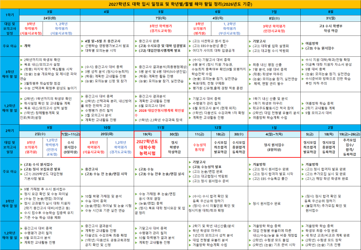 [2027학년도 대입을 위한 2026년 학년별, 월별 주요 일정 및 해야 할 일 가이드]