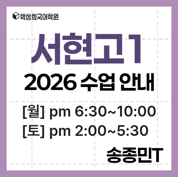 안녕하세요, 박상희국어학원입니다. 2026 서현고1 특화반 수업 소개드립니다. ★ 송종민 담임선생님 ★ 수능/내신 국어 22년 경력 강남구청 인강 7년 강사평가 1위 메가스터디 재종반 5년 강사평가 1위 내신부터 수능까지, '흔들리지 않는 국어의 힘'으로 완벽한 실전 시나리오 완성! 고등학교 내신은 물론, 수능까지 완벽 대비되는 종민쌤만의 서현고 특화 커리큘럼을 직접 확인해보세요! ▼ 서현고 간담회 신청하러 가기 ▼ https://blog.naver.com/pikacademy/224151807732 문의사항은 학원으로 연락 부탁드립니다. <img src="https://blogthumb.pstatic.net/MjAyNjAyMDlfMTY2/MDAxNzcwNjIyODM3Nzk1.I_ygjms_Yma9zsSwrZgvulcC-HDBKO0XpWUz5KB8eYQg.z1KDXQZLbUGl-yB7r_RFL2hkjHTpA24AjrzVyAvLw0Ag.JPEG/%B9%DA%BB%F3%C8%F1%B1%B9%BE%EE%C7%D0%BF%F8_25%B3%E2_2%C7%D0%B1%E2_%283%29.jpg?type=s3" />