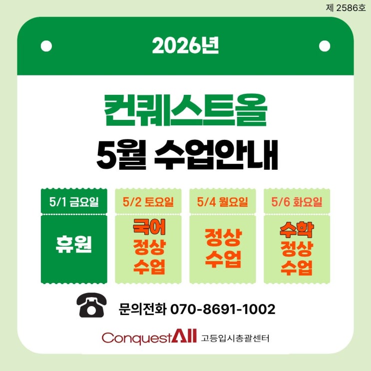 안녕하세요! 입시총괄센터 컨퀘스트올학원 센터장입니다 안녕하세요, 학부모님과 학생 여러분 5월 학원 일정 안내드립니다. 5월 1일 (금) : 전체 휴강 5월 2일 (토) : 국어 정상수업 5월 4일 (월) : 정상수업 5월 5일 (화) : 수학 정상수업 "중간고사 준비하시느라 모두 정말 수고 많으셨습니다." 그동안 애써주신 만큼 만족스러운 결과가 있으시기를 바랍니다. 특히 이번 시험을 통해 부족한 부분과 보완해야 할 영역을 확인하셨을 것으로 생각됩니다. 다가오는 5월 휴원일을 잘 확인하시어 충분히 휴식하며 재충전하는 시간 보내시기 바랍니다. 이후에는 확인된 취약점을 중심으로 보완하고, 학습 계획을 체....... <img src="https://blogthumb.pstatic.net/MjAyNjA0MjhfMjEw/MDAxNzc3MzYxNDg5MzM1.HcM5aQg6kQVVT2ed23V8icXO-m7zZ172_GclisQo8e0g.JHOqCKQoVZNqXRS49DB-bLnBenXMJP069dY9nQVTZkog.JPEG/%C4%C1%BF%C3_%BA%ED%B7%CE%B1%D7_%C0%CE%BD%BA%C5%B8_%288%29.jpg?type=s3" />